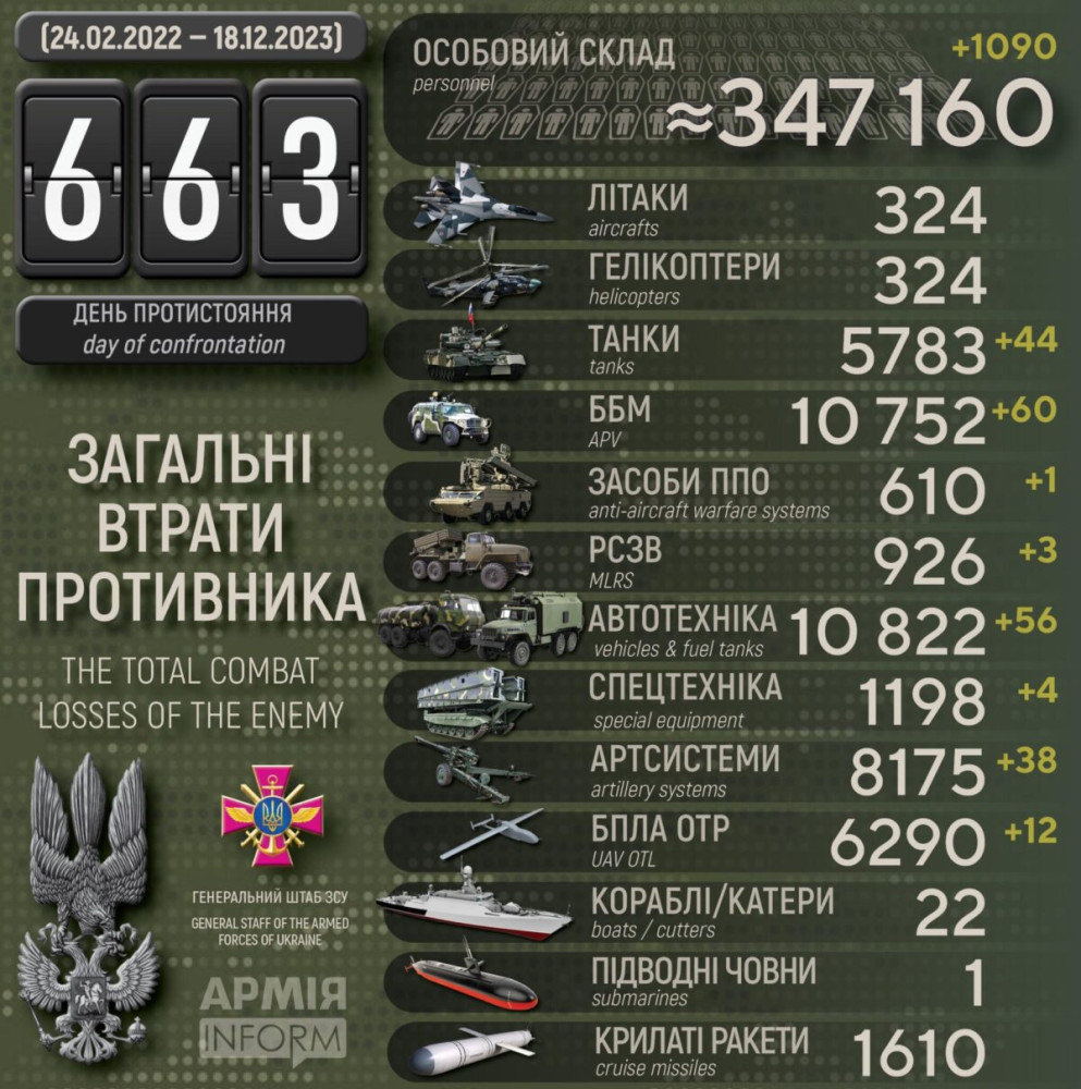 За добу українські захисники знищили 44 ворожі танки, 60 бронемашин та понад тисячу окупантів1090 осіб, 44 танки та 38 артсистем втратили російські окупанти минулої доби. Крім того, за даними Генерального штабу Збройних сил України, наші захисники також знищили 60 бойових броньованих машин, три РЗСВ, один засіб ППО, 12 БПЛА оперативно-тактичного рівня, 56 одиниць автомобільної техніки та чотири одиниці спецтехніки. Усього з початку повномасштабного вторгнення втрати ворога склали: особового складу — 347 160 осіб; танків ‒ 5783 одиниці; бойових броньованих машин ‒ 10752 одиниці; артилерійських систем – 8175 одиниць; РСЗВ – 926 одиниць; засоби ППО ‒ 610 одиниць; літаків – 324 одиниці; гелікоптерів – 324 одиниці; БПЛА оперативно-тактичного рівня – 6290; крилаті ракети ‒ 1610; кораблі /катери ‒ 22 одиниці; підводні човни — 1 одиницю; автомобільної техніки та автоцистерн – 10822 одиниці; спеціальна техніка ‒ 1198. СМЕРТЬ РОСІЙСЬКИМ ОКУПАНТАМ! Помітили помилку? Виділяйте слова з помилкою та натискайте control-enter |