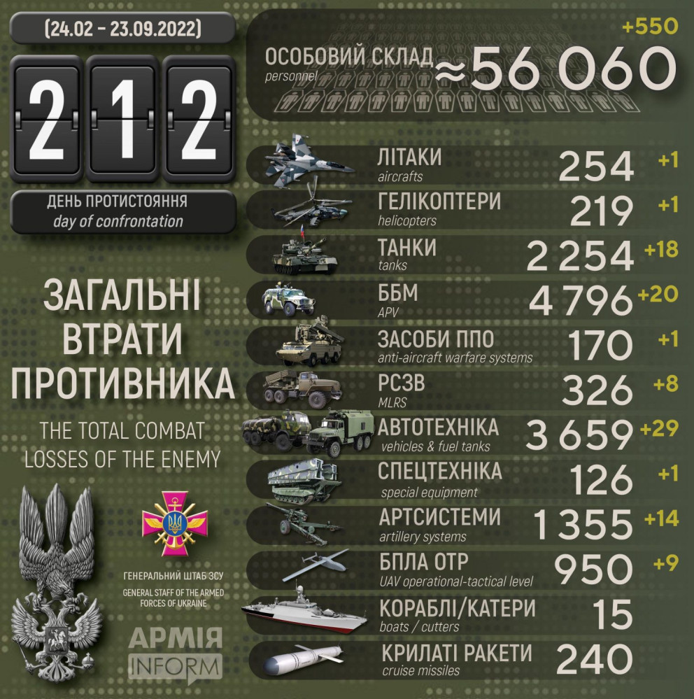 За добу українські захисники знищили 550 окупантів, один ворожий літак і 18 танків550 осіб, один літак і один гелікоптер втратили окупанти за минулу добу в Україні. Крім того, за даними Генерального штабу Збройних сил України, наші захисники також знищили 18 танків, 20 бойових броньованих машин, 14 артсистем, вісім РСЗВ, один ППО, дев'ять БПЛА оперативно-тактичного рівня, 29 одиниць автомобільної техніки і одну одиницю спецтехніки. Усього з початку повномасштабного вторгнення втрати ворога склали: особового складу — 56 060 осіб; танків ‒ 2254 одиниці; бойових броньованих машин ‒ 4796 одиниць; артилерійських систем – 1355 одиниць; РСЗВ – 326 одиниць; засоби ППО ‒ 170 одиниць; літаків – 254 одиниці; гелікоптерів – 219 одиниць; БПЛА оперативно-тактичного рівня – 950; крилаті ракети ‒ 240; кораблі /катери ‒ 15 одиниць; автомобільної техніки та автоцистерн – 3659 одиниць; спеціальна техніка ‒ 126. СМЕРТЬ РОСІЙСЬКИМ ОКУПАНТАМ! Помітили помилку? Виділяйте слова з помилкою та натискайте control-enter |