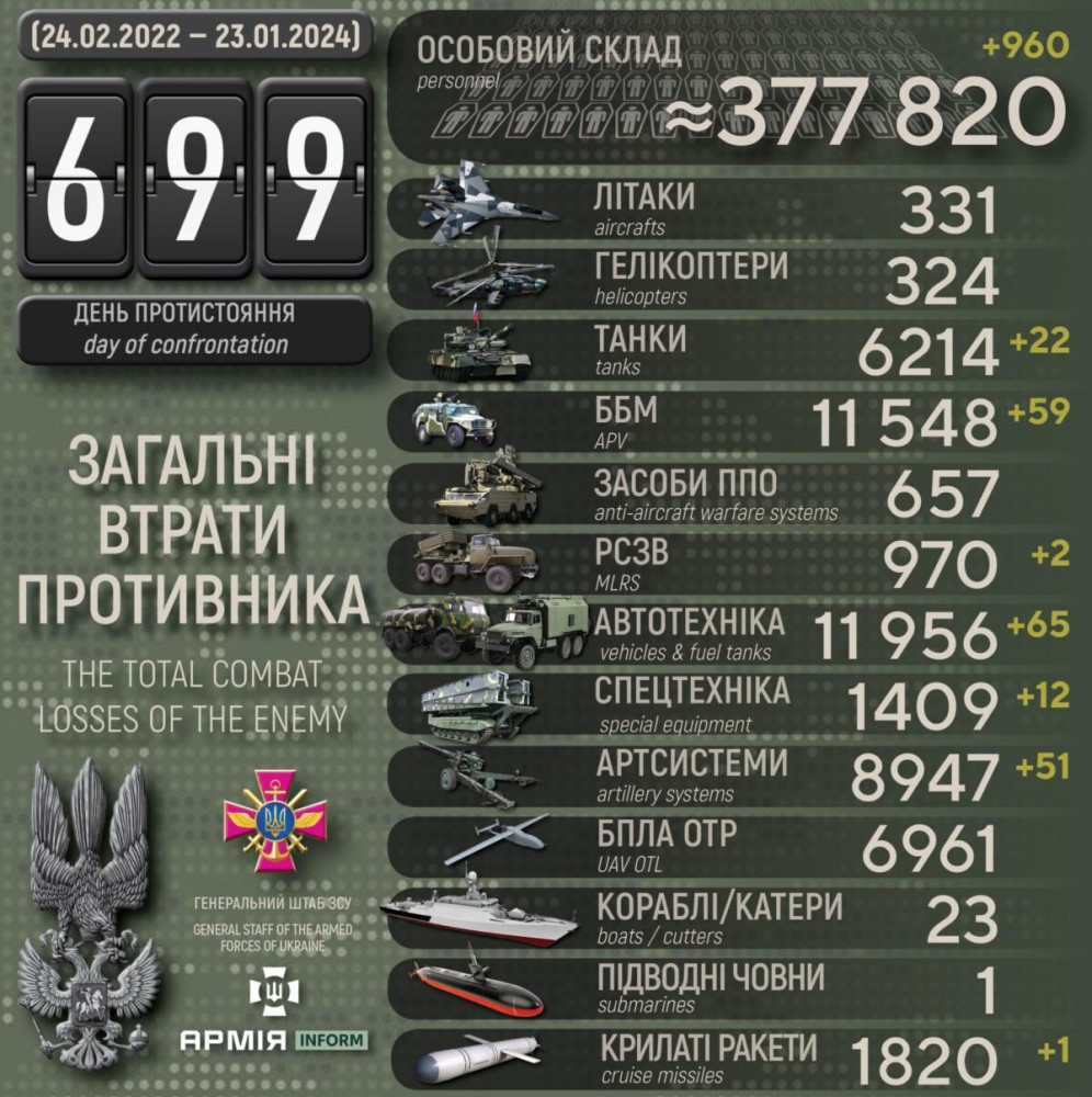 За добу українські захисники знищили 59 ворожих бронемашин, 51 артсистему та майже тисячу окупантів960 осіб, 22 танки та одну крилату ракету втратили російські окупанти минулої доби. Крім того, за даними Генерального штабу Збройних сил України, наші захисники також знищили 51 артсистему, 59 бойових броньованих машин, дві РСЗВ, 65 одиниць автомобільної техніки та 12 одиниць спецтехніки. Усього з початку повномасштабного вторгнення втрати ворога склали: особового складу — 377 820 осіб; танків ‒ 6214 одиниць; бойових броньованих машин ‒ 11548 одиниць; артилерійських систем – 8947 одиниць; РСЗВ – 970 одиниць; засоби ППО ‒ 657 одиниць; літаків – 331 одиницю; гелікоптерів – 324 одиниці; БПЛА оперативно-тактичного рівня – 6961; крилаті ракети ‒ 1820; кораблі /катери ‒ 23 одиниці; підводні човни — 1 одиницю; автомобільної техніки та автоцистерн – 11956 одиниць; спеціальна техніка ‒ 1409. СМЕРТЬ РОСІЙСЬКИМ ОКУПАНТАМ! Помітили помилку? Виділяйте слова з помилкою та натискайте control-enter |