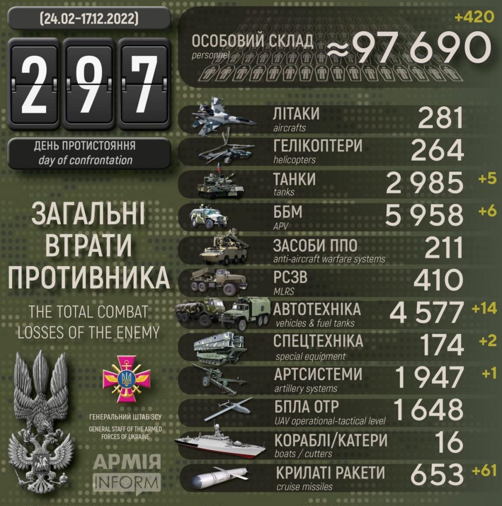 За добу українські захисники знищили 61 крилату ракету і понад 400 окупантів420 осіб, п'ять танків і 61 крилату ракету втратили окупанти в Україні за минулу добу. Крім того, за даними Генерального штабу Збройних сил України, наші захисники також знищили шість бойових броньованих машин, одну артсистему, 14 одиниць автомобільної техніки і дві одиниці спецтехніки. Усього з початку повномасштабного вторгнення втрати ворога склали: особового складу — 97 690 осіб; танків ‒ 2985 одиниць; бойових броньованих машин ‒ 5958 одиниць; артилерійських систем – 1947 одиниць; РСЗВ – 410 одиниць; засоби ППО ‒ 211 одиниць; літаків – 281 одиницю; гелікоптерів – 264 одиниці; БПЛА оперативно-тактичного рівня — 1648; крилаті ракети ‒ 653; кораблі /катери ‒ 16 одиниць; автомобільної техніки та автоцистерн – 4577 одиниць; спеціальна техніка ‒ 174. СМЕРТЬ РОСІЙСЬКИМ ОКУПАНТАМ! Помітили помилку? Виділяйте слова з помилкою та натискайте control-enter |