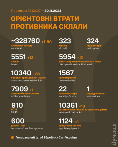За добу українські захисники знищили більше тисячі окупантів1180 солдатів і офіцерів, 13 танків та 28 бойових броньованих машин втратили російські загарбники минулої доби. За даними Генерального штабу Збройних сил України, наші захисники також знищили одну артилерійську систему, 10 безпілотників, 13 одиниць автомобільної техніки та автоцистерн та три - спецтехніки. Загальні бойові втрати противника з 24.02.22 по 30.11.23 орієнтовно становлять: особового складу ‒ 328760 (+1180) осіб ліквідовано танків ‒ 5551 (+13) бойових броньованих машин ‒ 10340 (+28) артилерійських систем ‒ 7909 (+1) РСЗВ ‒ 910 засобів ППО ‒ 600 літаків ‒ 323 гелікоптерів ‒ 324 БПЛА оперативно-тактичного рівня ‒ 5954 (+10) крилаті ракети ‒ 1567 кораблі/катери ‒ 22 підводні човни ‒ 1 автомобільної техніки та автоцистерн ‒ 10361 (+13) спеціальна техніка ‒ 1124 (+3). СМЕРТЬ РОСІЙСЬКИМ ОКУПАНТАМ! Помітили помилку? Виділяйте слова з помилкою та натискайте control-enter |