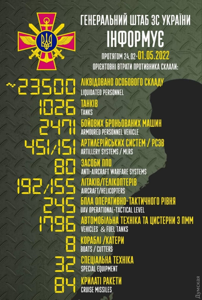 За сутки в Украине уничтожены 300 оккупантов, сожжены 18 танков и подбиты 13 беспилотниковСилы обороны Украины продолжают уничтожать российских агрессоров, вторгшихся на нашу землю. По данным Генерального штаба Вооруженных сил Украины, за вчерашний день вражеские потери составили 300 солдат и офицеров (23500 с начала полномасштабной войны). В Генштабе сообщили, что наши защитники вчера подбили 18 танков (1026) и 26 (2471) бронемашин врага. Также были уничтожены 15 (451) артиллерийских систем, три (80) системы ПВО, 20 (1796) автомобилей и цистерн с горючим. Сбиты два самолета (192) и 13 беспилотников оперативно-тактического уровня (245). СМЕРТЬ РОСІЙСЬКИМ ОКУПАНТАМ! Помітили помилку? Виділяйте слова з помилкою та натискайте control-enter |