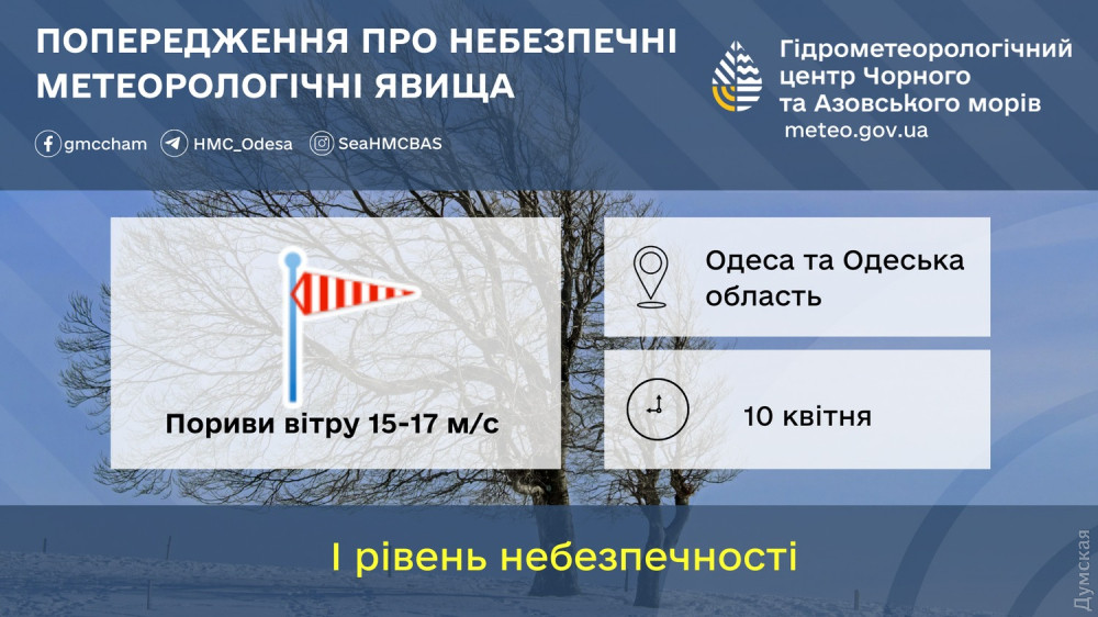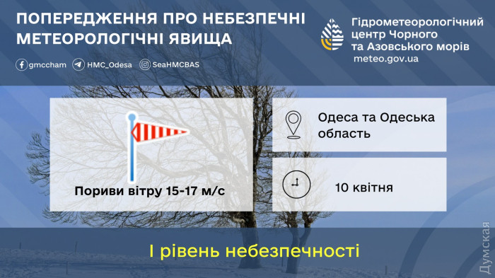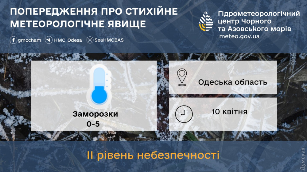 Заморозки и штормовой ветер: погода в Одесской области срывает весеннее настроениеШтормовое предупреждение из-за ночных заморозков и сильного ветра объявили в Одессе и области на четверг, 10 апреля. Об этом сообщили в Гидрометцентре Черного и Азовского морей. В регионе ночью и утром температура может опуститься до -5°С, в связи с чем синоптики предупреждают о втором (оранжевом) уровне опасности стихийного метеорологического явления. Кроме того, и в области, и в самой Одессе в четверг днем и вечером ожидается снег с дождем и штормовой ветер с порывами 15-17 м/с. В Одессе температура ночью +1-3°С, днем до +10°С. В области в ночное время до 5°С мороза, днем +5-10°С. В связи с ухудшением погодных условий одесситов просят максимально ограничить перемещения и поездки, особенно пожилых людей, детей и беременных женщин. Также не стоит оставлять транспортные средства под деревьями и линиями электропередач — возможно падение веток и кабелей. Из-за шторма в Черном море увеличивается минная опасность: возможен срыв мин с якорей и их дрейф вдоль побережья, поэтому находиться в пляжной зоне крайне опасно. При обнаружении морской мины или похожих предметов немедленно звоните по номеру 102. СМЕРТЬ РОССИЙСКИМ ОККУПАНТАМ! Заметили ошибку? Выделяйте слова с ошибкой и нажимайте control-enter |