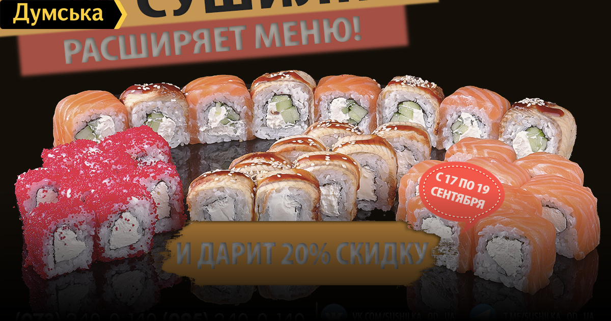 Запеченные роллы и новые сеты: «Сушилка» снова расширяет меню (на правах рекламы)Со следующей недели клиентов службы доставки «Сушилка» ждет очередной масштабный апгрейд меню. Так, сервис добавит около 20 новых роллов, среди которых будут роллы с красной икрой, стружкой тунца, омлетом, икрой тобико, грушей. Добавили четыре новых сета. Также меню пополнят запеченные роллы, имеющие в своем составе семгу, снежный краб, угорь и мидии. Помимо роллов добавят две новые пиццы — с мясным бортиком из ветчины для мясных гурманов, а для жаждущих новых вкусовых ощущений — с грушей, говядиной и карамелизированным орехом. Кроме того, «Сушилка» добавит два новых салата с угрем, гунканы с тобико и красной икрой. А приятным бонусом станет 20% скидка на все новинки, которая продлится с 17 по 19 сентября включительно. Заказ можно сделать на сайте sushilka.od.ua или по телефонам: 073-240-0-140 (Lifecell); 095-240-0-140 (Vodafone); 096-240-0-140 (Kyivstar); 048-735-29-99 (городской). СМЕРТЬ РОСІЙСЬКИМ ОКУПАНТАМ! Помітили помилку? Виділяйте слова з помилкою та натискайте control-enter |