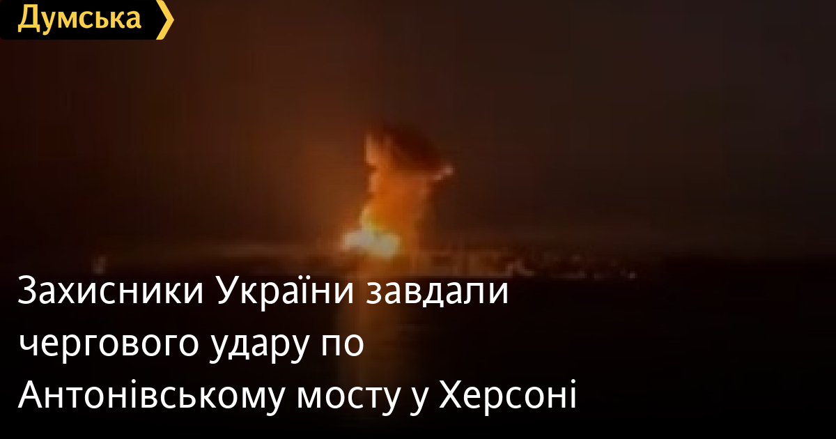 Захисники України завдали чергового удару по Антонівському мосту у ХерсоніЧерговий удар по Антонівському мосту в Херсоні завдали Сили оборони України минулої ночі. Як повідомила прессекретар Об'єднаного координаційного центру Сил оборони півдня Наталія Гуменюк, наразі міст став «остаточно непроїзним». СМЕРТЬ РОСІЙСЬКИМ ОКУПАНТАМ! Помітили помилку? Виділяйте слова з помилкою та натискайте control-enter |