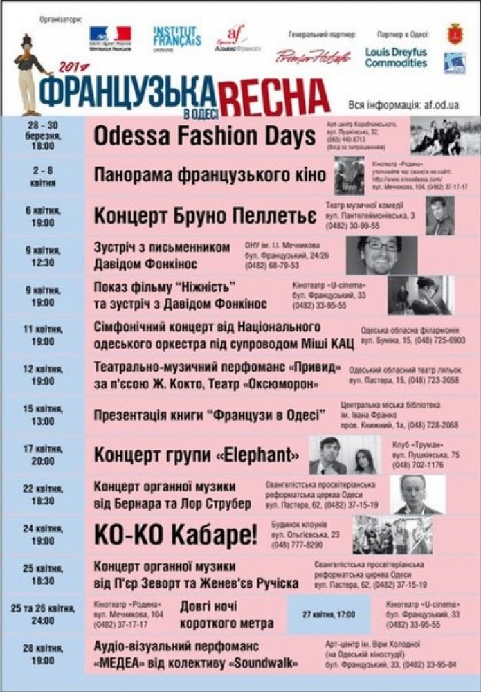 В субботу, 29 марта, Alliance Française Odessa и Одесская городская ярмарка приглашают одесситов и гостей города на открытие «Французской весны-2014». Мероприятие пройдет в рамках Одесской городской ярмарки (ул. Дерибасовская) с 12:00 до 18:00. «Мы решили отказаться в этом году от традиционного гламура, чтобы окунуть вас в искренний и беззаботный мир французской ярмарки! Веселые клоуны и ходулисты, жонглеры и мимы, настоящая французская выпечка, всем известные французские мелодии, французская фото-зона, и самое главное — возможность выиграть билеты на многочисленные мероприятия Фестиваля «Французская весна», — сообщают организаторы. СМЕРТЬ РОСІЙСЬКИМ ОКУПАНТАМ! Помітили помилку? Виділяйте слова з помилкою та натискайте control-enter |