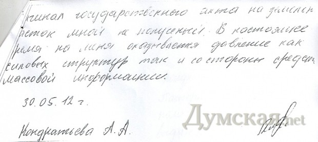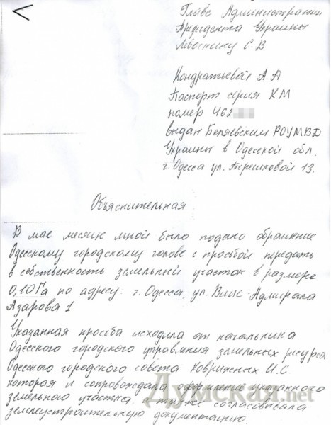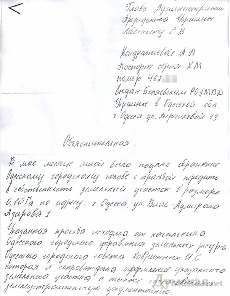 А сама объяснительная: «Указанная просьба исходила от начальника Одесского городского управления земельных ресурса (с теми же ошибками)» и далее по тексту Кто-то может себе представить ту же Коврижных, бегающую по городу и первым встречным предлагающую незаконно оформить на себя землю в «Отраде»?