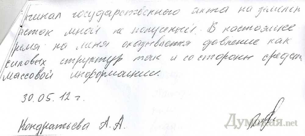 Редакция «Думской» получила копию объяснительной, которую написала Анна Кондратьева — одна из фигурантов дела о 46 сотках в Отраде.