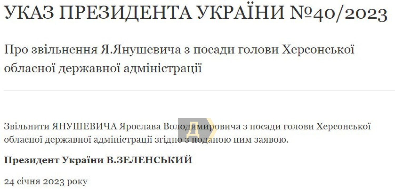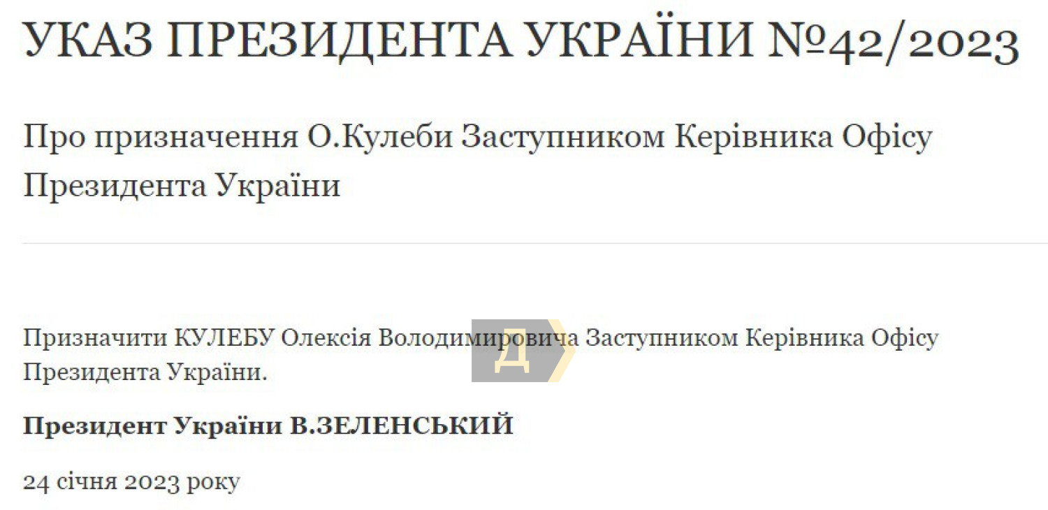 Зеленський призначив нового заступника голови свого Офісу і звільнив кількох начальників військових адміністраційУкази про призначення нового заступника глави Офісу президента і звільнення з посад кількох начальників обласних військових адміністрацій підписав сьогодні, 24 січня, Володимир Зеленський. Так, новим заступником голови Офісу президента замість звільненого напередодні Кирила Тимошенка стане Олексій Кулеба, який раніше очолював Київську обласну військову адміністрацію. Крім Київської ОВА, без керівників тимчасово залишилися також Дніпропетровська, Запорізька, Сумська та Херсонська військові адміністрації. Які посади обіймуть Валентин Резніченко, Олександр Старух, Дмитро Живицький та Ярослав Янушевич — поки невідомо. Помітили помилку? Виділяйте слова з помилкою та натискайте control-enter |