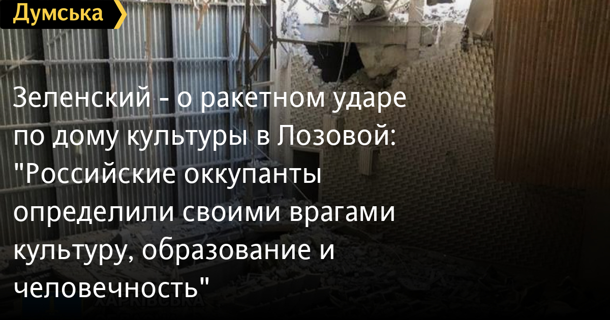 Зеленский — о ракетном ударе по дому культуры в Лозовой: «Российские оккупанты определили своими врагами культуру, образование и человечность»Президент Украины Владимир Зеленский отреагировал на ракетный удар российских оккупантов по дому культуры в Лозовой Харьковской области, в результате которого пострадали семь человек. Глава государства подчеркнул, что российские оккупанты определили своими врагами культуру, образование и человечность. «Российский ракетный удар по только что реконструированному зданию дома культуры. Семь пострадавших, среди которых 11-летний ребенок, — отметил Зеленский. — Что в голове у людей, выбирающих вот такие мишени? Абсолютное зло, абсолютная глупость». Отметим, что Харьковская областная прокуратура начала досудебное расследование по факту нарушения законов и обычаев войны (ч. 1 ст. 438 УК Украины). По данным следствия, 20 мая 2022 года около 15 часов российские военные нанесли ракетный удар по городскому дворцу культуры в г. Лозовая. В результате действий страны-агрессора получили ранения 7 мирных жителей, среди них 11-летняя девочка, Повреждено здание городского дворца культуры и около 10 многоэтажек, расположенных рядом. В пресс-службе Харьковской ОВА также добавили, что пострадавшие – девочка, двое мужчин и четыре женщины на момент ракетного удара находились рядом с Дворцом культуры. Их всех госпитализировали с осколочными ранениями конечностей. Их состояние оценивается как средней тяжести. СМЕРТЬ РОССИЙСКИМ ОККУПАНТАМ! Заметили ошибку? Выделяйте слова с ошибкой и нажимайте control-enter |