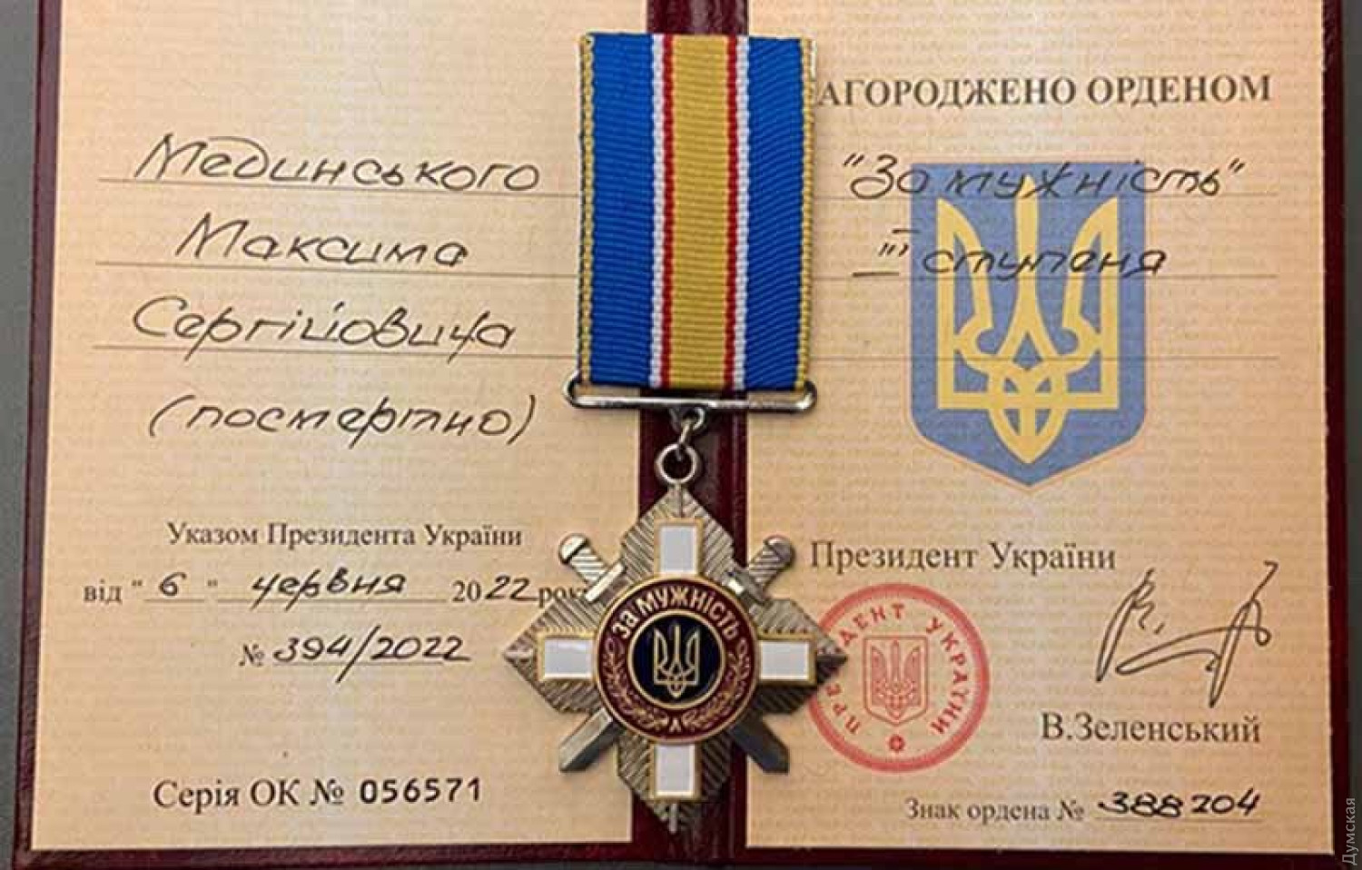 Уроженец Болграда, заместитель командира по морально-психологическому обеспечению одного из подразделений 95-й отдельной десантно-штурмовой бригады Максим Мединский награжден орденом «За мужество» III степени посмертно. Как сообщает Болградская районная госадминистрация, президент Владимир Зеленский вручил орден жене погибшего военнослужащего Татьяне. Максим Мединский 24 февраля пришел в военкомат и был мобилизован в ДШВ. Погиб 29 апреля в бою под Харьковом. Во время вражеского артобстрела он получил смертельное осколочное ранение. 12 мая его похоронили в селе Ксаверивка в Киевской области. Вечная память и слава герою! СМЕРТЬ РОСІЙСЬКИМ ОКУПАНТАМ! Помітили помилку? Виділяйте слова з помилкою та натискайте control-enter |