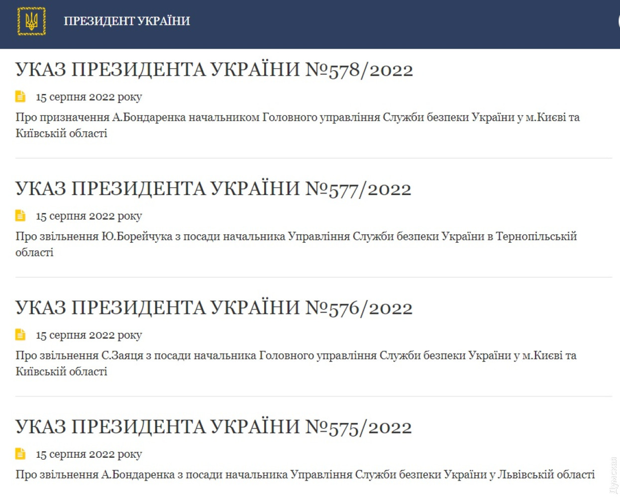 Зеленський звільнив начальників СБУ у трьох областях України: львівського одразу призначив на КиївщинуПрезидент України Володимир Зеленський звільнив одразу трьох начальників обласних управлінь Служби безпеки України. Відповідні укази розміщено на сайті Офісу Президента. Йдеться про три області – Київську, Львівську та Тернопільську області. Водночас, практично відразу з'явився указ про призначення екс-очільника СБУ у Львівській області Артема Бондаренка керівником управління в Києві та області. Нагадаємо, до цього звільнення керівництва СБУ у кількох областях сталося наприкінці травня. Тоді, зокрема, втратив посаду голова відомства в Харківській області Роман Дудін. СМЕРТЬ РОСІЙСЬКИМ ОКУПАНТАМ! Помітили помилку? Виділяйте слова з помилкою та натискайте control-enter |