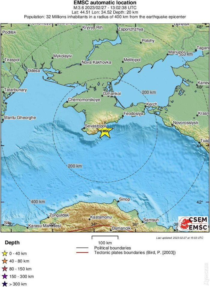 Землетрус у Чорному морі: поштовхи були в безпосередній близькості від району розгортання російських підводних човнівЗемлетрус магнітудою 3,4 зафіксували біля південного берега тимчасово окупованого Криму. Про це повідомляє Андрій Клименко з Інституту Чорноморських стратегічних досліджень. Зазначимо, що поштовхи були зафіксовані в безпосередній близькості від району розгортання російських підводних човнів. СМЕРТЬ РОСІЙСЬКИМ ОКУПАНТАМ! Помітили помилку? Виділяйте слова з помилкою та натискайте control-enter |