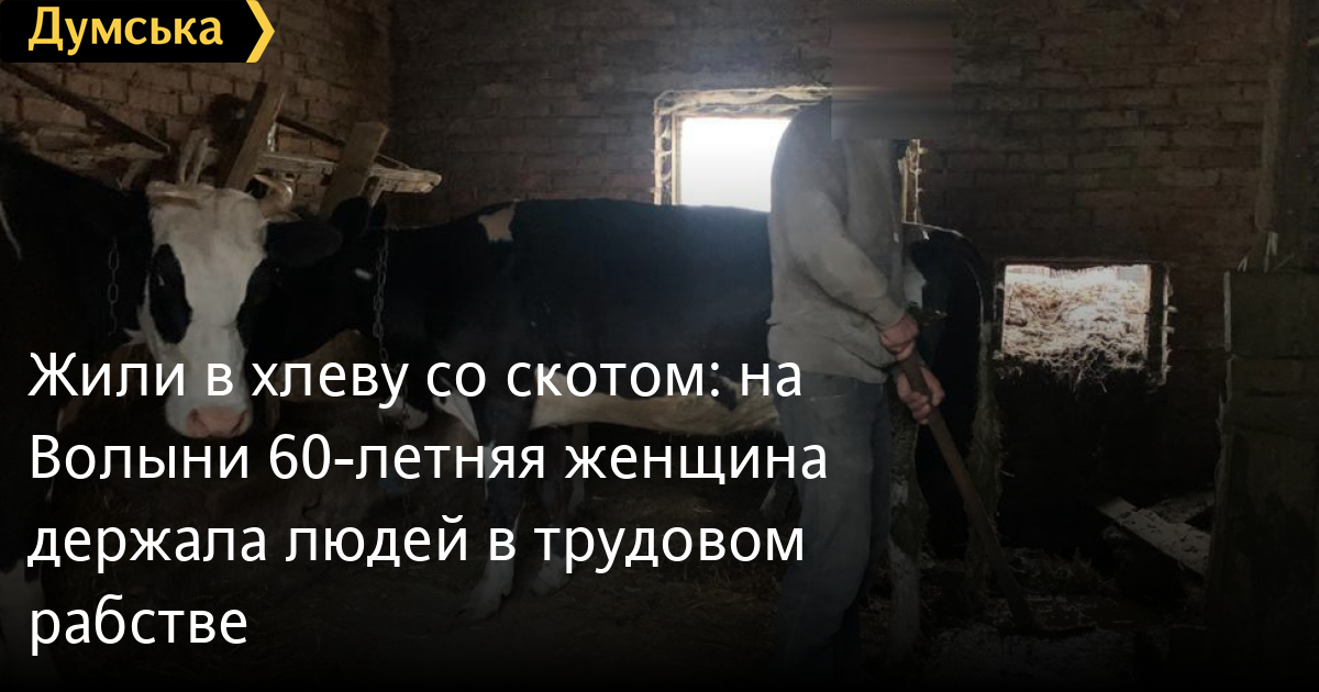 Жили в хлеву со скотом: на Волыни 60-летняя женщина держала людей в трудовом рабстве60-летняя жительница Волыни удерживала людей в трудовом рабстве и держала их в хлеву вместе с животными. Об этом сообщила пресс-служба Нацполиции. Уроженка села Вербаев Луцкого района подыскивала будущих «сотрудников» на рынках и автостанциях Луцка. Ее жертвами становились преимущественно мужчины, попавшие в затруднительное материальное положение. Злоумышленница предлагала им ухаживать за домашним скотом за вознаграждение. После этого везла в свои хозпостройки, где отбирала документы и селила в хлеву вместе с животными. За проделанную работу «предпринимательница» не рассчитывалась и угрожала физической расправой в том случае, если ее подчиненные покинут территорию хозяйства. Полиция пресекла противоправную деятельность рабовладелицы. Правоохранители освободили троих мужчин, которых она незаконно лишила свободы. Злоумышленнице объявили о подозрении по ч. 1 ст.149 (торговля людьми) и по ч. 1 ст.357 (присвоение документов путем мошенничества) УК Украины. Досудебное расследование завершено. Обвинительный акт в отношении фигурантки уже направлен в суд. СМЕРТЬ РОССИЙСКИМ ОККУПАНТАМ! Заметили ошибку? Выделяйте слова с ошибкой и нажимайте control-enter Новости по этой теме: 12 января 2022: Харьковские станции метро ожидает масштабная проверка: в вестибюле подземки на площади Конституции рухнул потолок (фото) 8 января 2022: В Одессе из офиса фирмы выкрали сейф с внушительной суммой денег, золотом и пистолетом 27 декабря 2021: В лесополосе под Киевом нашли тело главврача из Ровенской области: по подозрению в убийстве задержаны таксист с приятелем 23 декабря 2021: В Киеве задержали подозреваемых мошенников, которые обманывали на свиданиях мужчин ради денег |