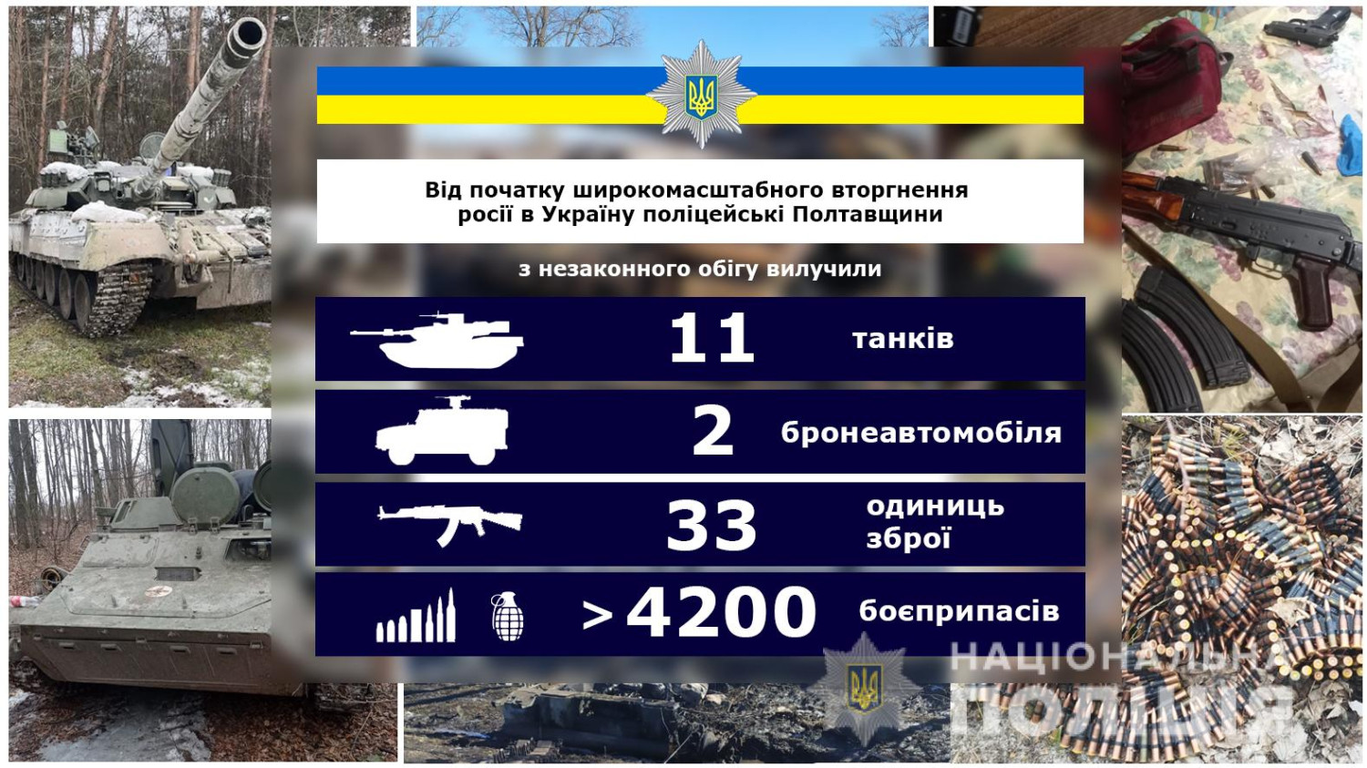 Жители Полтавской области припрятали одиннадцать танков и два бронемобиля российских нацистов — полиция технику изъялаОдиннадцать вражеских танков, два бронеавтомобиля, восемь пулеметов, девять автоматов, пять винтовок, десять пистолетов и сотни боеприпасов изъяла полиция Полтавской области у местных жителей с начала полномасштабного вторжения российских нацистов. Об этом сообщил начальник регионального главка Евгений Рогачев. Также главный полицейский области обратился к жителям Полтавщины: немедленно сообщать на 102 о подобных находках в лесополосах, лесах, полях или на обочинах дорог. Если кто-то хранит вражеское оружие, боеприпасы, военную технику или другие опасные предметы дома, полиция просит добровольно все сдать. Найденное будет использовано силами обороны в борьбе с оккупантами. По фактам выявления военной техники оккупанта, огнестрельного оружия, патронов, боеприпасов (в том числе снарядов и гранат) следователями полиции Полтавской области расследуется 31 уголовное производство по части 1 статьи 263 (незаконное обращение с оружием, боевыми веществами) Уголовного кодекса Украины. СМЕРТЬ РОСІЙСЬКИМ ОКУПАНТАМ! Помітили помилку? Виділяйте слова з помилкою та натискайте control-enter |
