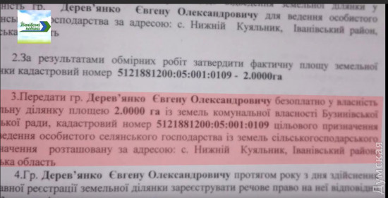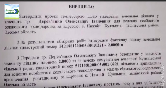 Жители села в Одесской области жалуются, что сельский голова проводит махинации с землейСкандал вспыхнул в селе Бузиновка Ивановского района. Там местные жители жалуются на председателя сельсовета Александра Деревянко – якобы он проводит манипуляции с землей. Так, местным журналистам стало известно, что чиновник, используя свое служебное положение, выделил по 2 га земли в подконтрольном ему сельсовете для себя и своего сына. «Это не говорит, а кричит о злоупотреблении служебным положением», — отмечают авторы сюжета «Ивановские новости». Местные жители говорят, что в сельсовете происходят и другие махинации с землей – паи, которые были оформлены на одних людей, непонятным образом оказываются в аренде у других. СМЕРТЬ РОСІЙСЬКИМ ОКУПАНТАМ! Помітили помилку? Виділяйте слова з помилкою та натискайте control-enter |