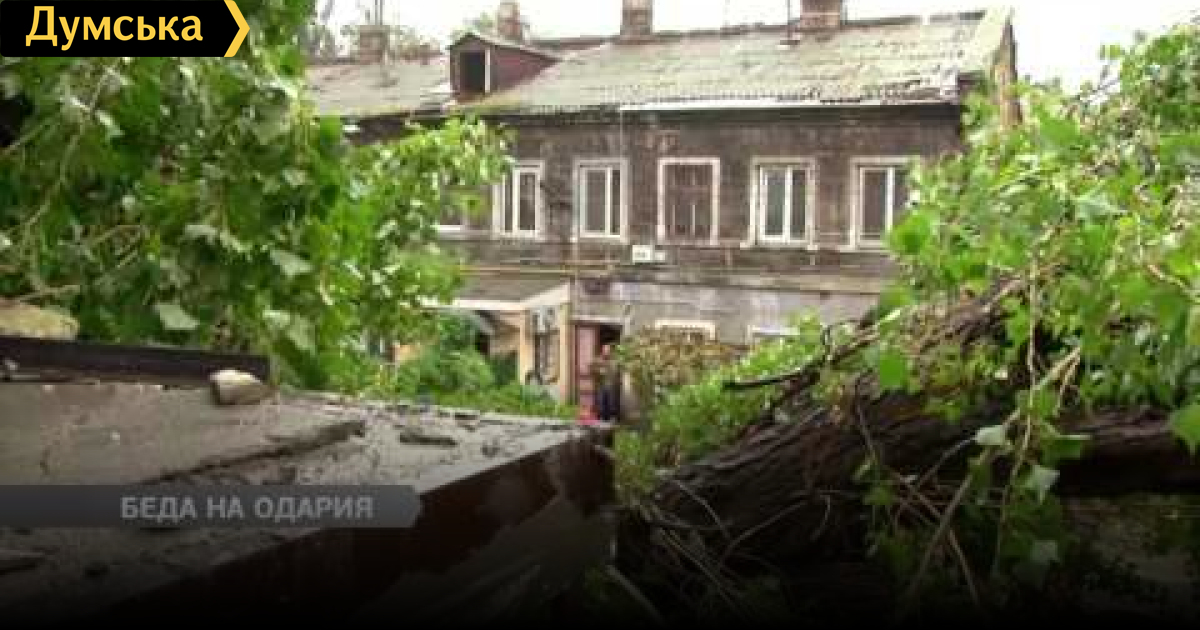 Местные жители на Одария, 18, где на жилой дом упали два дерева, бьют тревогу. Крупный ствол остается на крыше здания и угрожает безопасности людей.