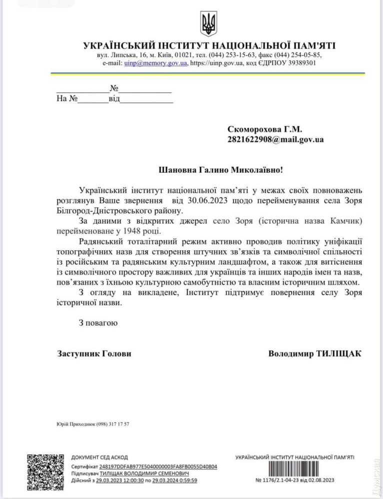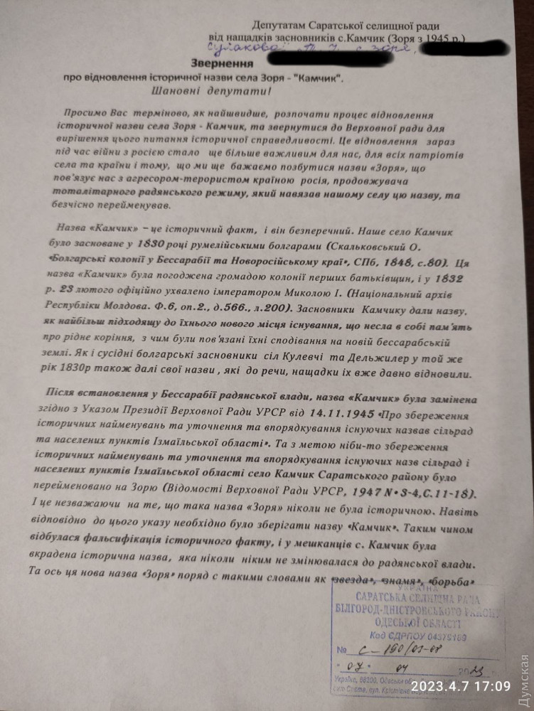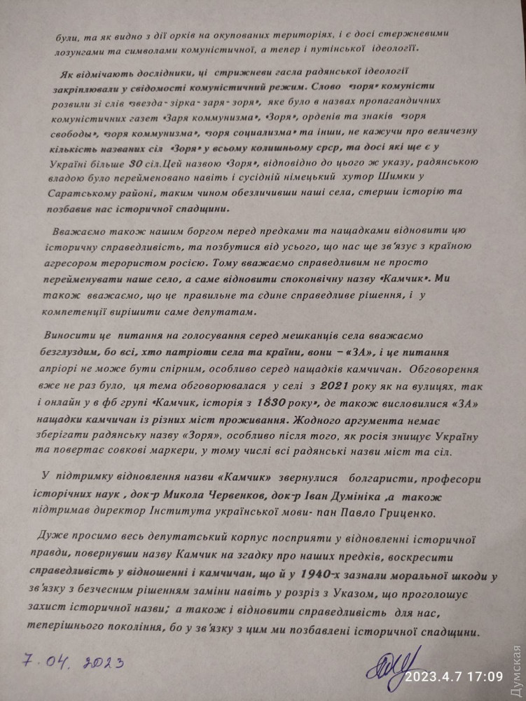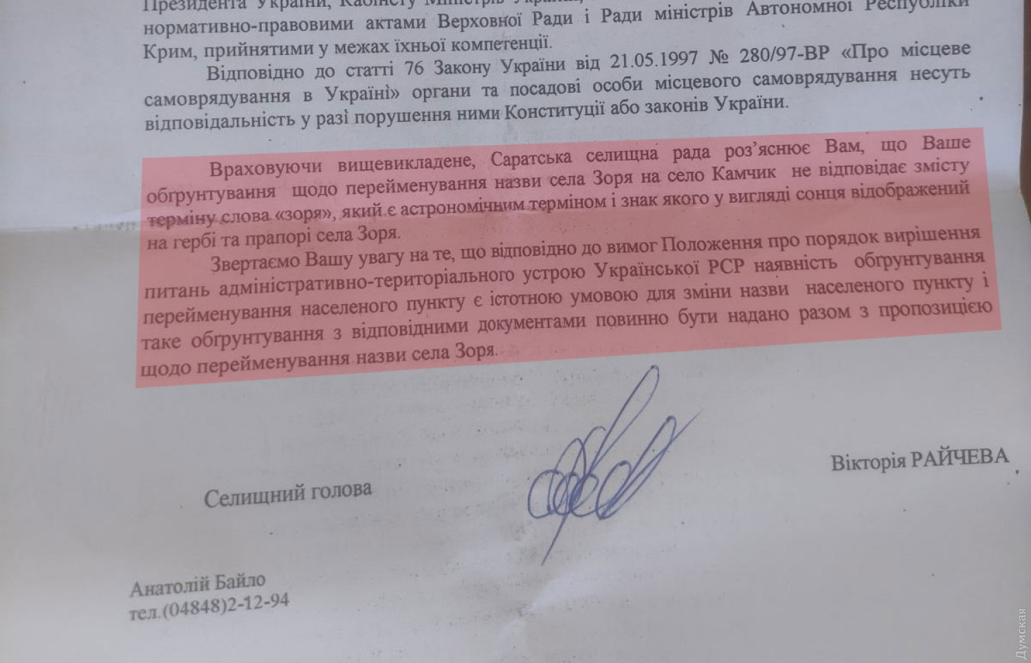 Жителі півдня Одеської області намагаються повернути історичну назву своєму селу: місцева влада каже «не на часі»Історичну назву Камчик хочуть повернути селу Зоря Білгород-Дністровського району Одеської області його жителі. Однак люди зіткнулися з несподіваним опором місцевої влади, розповіла «Думській» одна з ініціаторів перейменування Тетяна Сулакова. За її словами, село заснували 1830 року румелійські болгари, які перебралися в Бессарабію з берегів річки Камчія. «На згадку про своє коріння, про рідні місця поселенці й дали назву Камчик, — розповіла Тетяна. — Як і їхні сусіди, болгарські засновники сіл Кулевча і Дельжилер 1830 року. Вони, до речі, вже повернули собі історичні назви, а ми все ніяк не можемо». Після Другої світової війни, у 1948-му, тоталітарний радянський режим, не питаючи жителів, перейменував село на Зорю. Громадські діячі порушили питання повернення історичної назви 2021-го року і кілька разів виносили його на голосування, як на вулицях населеного пункту, так і на форумах у соціальних мережах, заручилися підтримкою Інституту нацпам'яті. Однак ініціатива громади чомусь не знайшла підтримки в керівників Саратської сільської ради та місцевих депутатів. «Ми звернулися до місцевого депутата Георгія Чикличі, спочатку усно, потім письмово, але відповіді так і не отримали, — розповіла Тетяна Сулакова. — Уже під час повномасштабного вторгнення було кілька звернень на ім'я голови Саратської ОТГ Вікторії Райчевої, але її відповіді — це взагалі абсурд: «Зоря — це астрономічний термін, тому треба його залишити». Потім ми зібрали підписи понад 100 осіб і відправили звернення на сесію ОТГ, але його сховали і навіть не показали депутатам». За словами громадської діячки, головний аргумент чиновників, мовляв, перейменування обійдеться дорого, викличе адміністративні труднощі. Загалом, «не на часі». «Вони весь час кажуть «не на часі», намагаються переконати жителів, що це принесе якісь складнощі, — підкреслює Сулакова. — Але назва Камчик — це наша історична спадщина, яку було відібрано в наших предків. Ще живі люди, які пам'ятають справжню назву села і наша мета, як нащадків, встановити історичну справедливість, особливо зараз під час російської агресії». Ми марно намагалися зв'язатися з головою Саратської ОТГ Вікторією Райчевою, щоб дізнатися її думку з цього питання. «Думська» готова розмістити її коментар, якщо такий буде. СМЕРТЬ РОСІЙСЬКИМ ОКУПАНТАМ! Помітили помилку? Виділяйте слова з помилкою та натискайте control-enter |