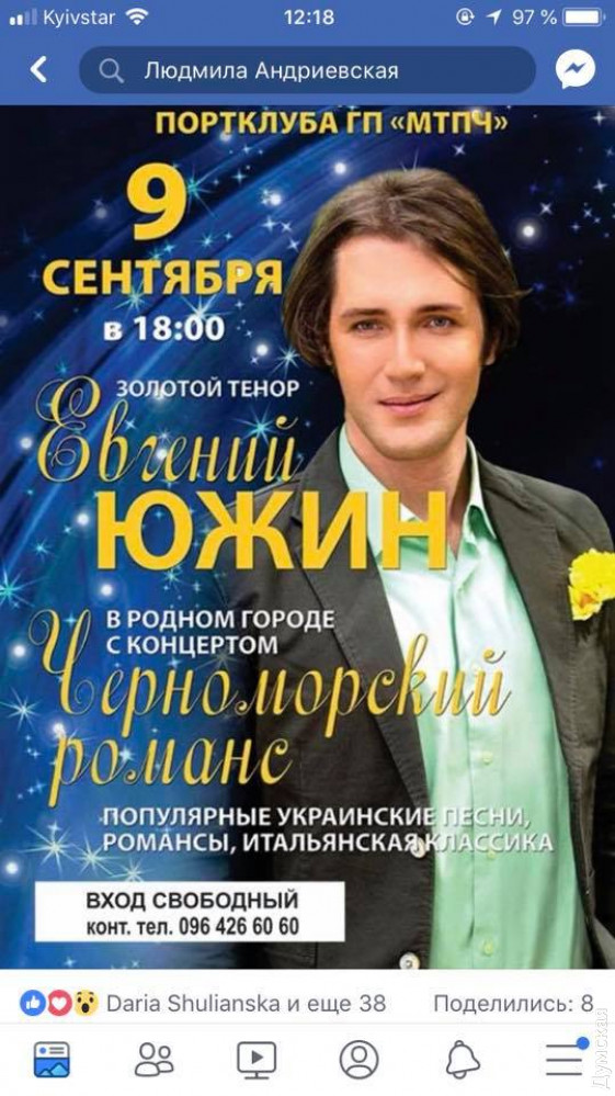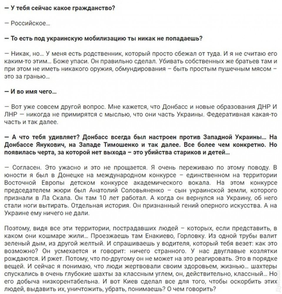 В Черноморске хочет выступить певец, который сотрудничает с минобороны РФ и поддерживает агрессию против УкраиныРоссийский певец Евгений Сильченко (Южин), который неоднократно публично высказывался в поддержку оккупации Украины российско-террористическими войсками, собрался выступить в сентябре в Черноморске Одесской области. Соответствующие плакаты появились на улицах города. Именующий себя «золотым тенором России» Сильченко-Южин активно сотрудничает с центральным военным оркестром министерства обороны Российской Федерации и регулярно выступает на официальных мероприятиях вооруженных сил страны-агрессора. Родился он в Черноморске в 1984 году. С 2002 года постоянно живет в РФ, получил гражданство этой страны. ОБНОВЛЕНО. Когда эта заметка уже была готова к публикации, стало известно, что Южин отменил концерт на преданной им родине. Видимо, понял, что его поездка закончится на пограничном пропускном пункте. СМЕРТЬ РОСІЙСЬКИМ ОКУПАНТАМ! Помітили помилку? Виділяйте слова з помилкою та натискайте control-enter |