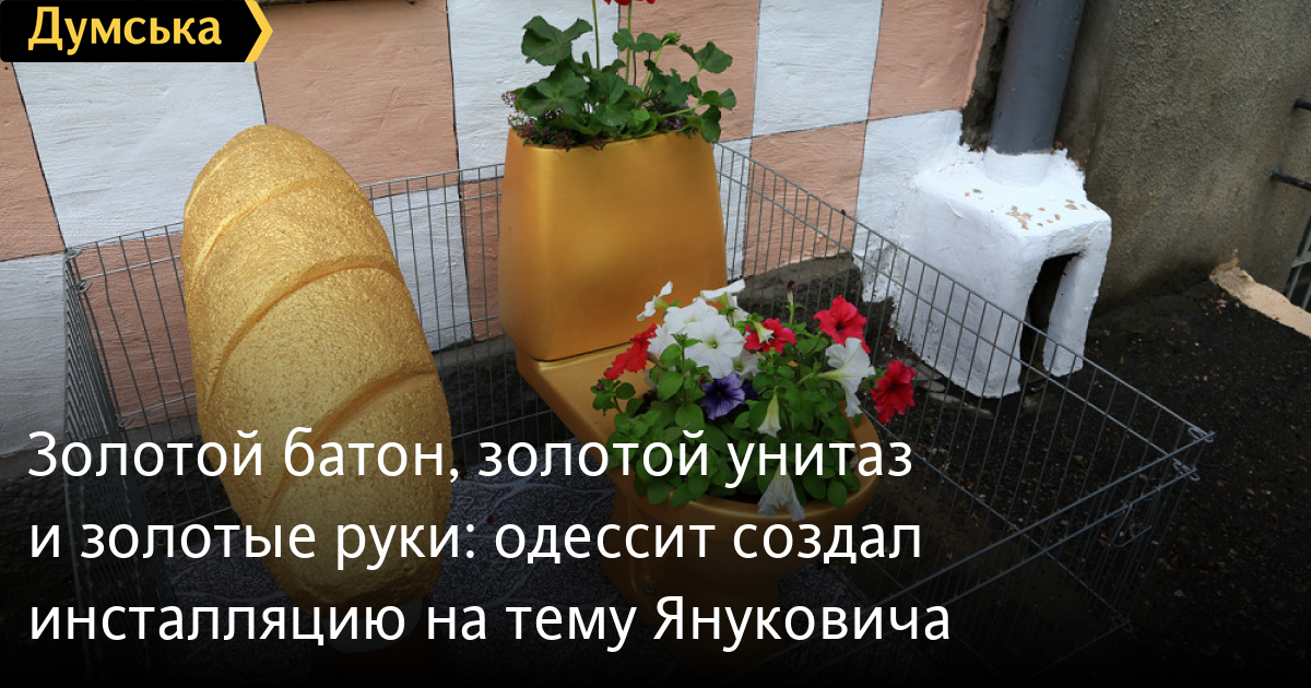 В самом центре Одессы, в Мукачевском переулке, что напротив театра Музыкальной комедии, появился памятник золотому батону и унитазу из того же материала. Корреспондент «Думской» побывал в одесском Межигорье. Инсталляция, включающая в себя основные символы режима Виктора Януковича и цветник, выросла рядом с домом №1/3. Батон возвышается на постаменте, а золотое чудо сантехники внутри украшено цветами и огорожено от вандалов небольшой металлической оградкой. Композиция окрашена ярким золотистым металликом и очень похожа на настоящие атрибуты «легитимного». Вокруг чистота и порядок, предусмотрена даже ночная подсветка и видеонаблюдение на случай непредвиденных ночных гостей. Автор «памятника», улыбаясь, рассказывает о том, как ему пришла в голову такая идея. «Все началось с благоустройства двора и забора, выходящего в переулок, — говорит Игорь Красняк. — Я своими руками делал ограду, красил и украшал забор и стены. Единственное, что пришлось купить — это аиста, которого достаточно трудно слепить из подручных материалов, все остальное сделал сам». Игорю Васильевичу уже семьдесят лет, он профессиональный кок, всю жизнь проработавший на судах ЧМП. Сейчас ветеран на пенсии, и у него много свободного времени, но он не дает себе скучать и занимается творчеством. Попутно подрабатывает дворником в ОСМД нового высотного дома. По словам мастера, унитаз он поставил еще в прошлом году, а юморные соседи попросили добавить к нему золотой батон. Так совместными усилиями и получилась эта инсталляция. «Мне нравится, когда вокруг чистота и есть на что посмотреть, — признается бывший моряк. — Люблю делать для людей приятные вещи, люблю, когда соседи говорят мне спасибо». На лестничной клетке своего дома Игорь Васильевич сделал ремонт и украсил стены рисунками. Везде цветы, игрушки и даже зеркала. Аккуратно подрезанные деревья и цветы, высаженные рядом с домом на клумбах, — все это тоже его рук дело. Соседи по переулку уважают «золотых дел» мастера и с гордостью рассказывают о нем. Автор — Сергей Смоленцев СМЕРТЬ РОССИЙСКИМ ОККУПАНТАМ! Заметили ошибку? Выделяйте слова с ошибкой и нажимайте control-enter |