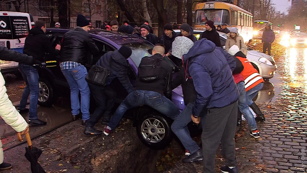 19 листопада 2018: На Французском бульваре из-за упавшей в яму машины стоят трамваи