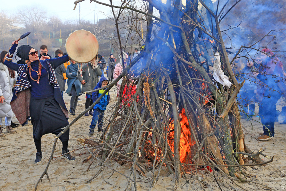 14 березня 2021: Шаманы, варганы и языческий шабаш: на собачьем пляже театрально справили Масленицу (фото)