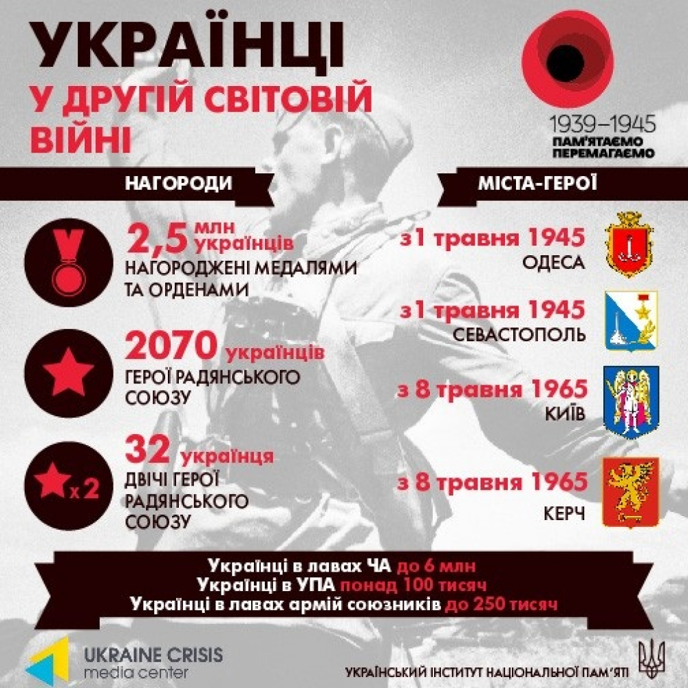Традиционно, накануне 9 мая российские СМИ активно пытаются изобразить украинцев сторонниками и коллаборационистами фашизма и нацизма, но факты говорят совершенно противоположное Для украинцев война началась в марте 1938 года, когда в результате Мюнхенского сговора, дружеские Германии венгерские войска оружием захватили недавно провозглашенную Карпатскую Украину, которая перед тем была в составе Чехо-Словакии. В боях было потеряно 430 убитыми и больше 400 раненых бойцов Карпатской Украины. Совокупные потери сечевиков, по разным данным, составили от 2 до 6, 5 тысяч человек. Это объясняется тем, что большинство из них погибла не в столкновениях с регулярными венгерскими частями, а в результате зачисток и расстрелов пленных. Венгерское население начало охотиться за группами сечевиков и убивать их на месте без суда и следствия.2. В сентябрьской кампании 1939 года уже 112 тысяч украинцев вступили в поединок с Вермахтом в составе Войска Польского, 7 834 солдат украинской национальности погибли в боях с Вермахтом под польскими флагами, а 16 тысяч получили ранения.3. В Украине Красная армия широко практиковала так называемый «досрочный» призыв юношей 16 — 17 лет, которых без подготовки и часто плохо вооруженных сразу бросали в бой, в результате чего они массово гибли.4. В целом во Второй мировой войне погиб каждый пятый украинец. Среди военнослужащих призыва на лето 1941 года уцелели только 3% из общего количества.5. Общие демографические потери Украины — с убитыми, жертвам концлагерей, депортированными и эвакуированными — составляют не менее 14 млн. человек. Из 41, 7 миллиона людей, которые жили до войны в УССР, к 1945 году осталось только 27, 4 миллиона человек.6. Во время эвакуации с Украины на Восток было вывезено около тысячи лучших промышленных предприятий Украины, которые после войны не вернули в родные города. Предприятия, за создание которых украинский народ заплатил собственной кровью (в буквальном смысле этого слова), стали основой создания военно-промышленного комплекса в восточной части СССР в послевоенные годы.7. В 1941 году советская власть при отступлении оставляла «выжженную землю». При эвакуации в Запорожье взорвали Днепрогэс. Об этом не знало ни гражданское население, ни даже вблизи расположены военные части, значительная часть которых была потоплена водяным валом Днепрогэса. В Днепропетровске был взорван хлебокомбинат вместе с рабочими. В Одессе, при отступлении Красной армии, затопили приморские кварталы вместе с жителями, а раненых красноармейцев сбросили в море вместе с санитарными машинами. Из Харькова вывезли сотни представителей интеллигенции, чтобы их сжечь в закрытом доме. В Умани живыми замуровали людей в погребе. Таких примеров много. И все это делали не нацисты, а коммунисты при отступлении.8. Корреспондент газеты «Saturday Evening Post», посетив в 1945 году Украину, с ужасом написал: «То, что кое-кто пытается изобразить как «русскую славу», было, прежде всего, украинской войной. Ни одна европейская страна не пострадала больше от глубоких ран, нанесенных своим городам, своей промышленности, сельскому хозяйству, человеческой силе».9. Вторая мировая война полностью изменила этническое лицо украинского общества. В Украине исчезли такие влиятельные ранее национальные меньшинства, как немцы (которых депортировали в восточные регионы СС