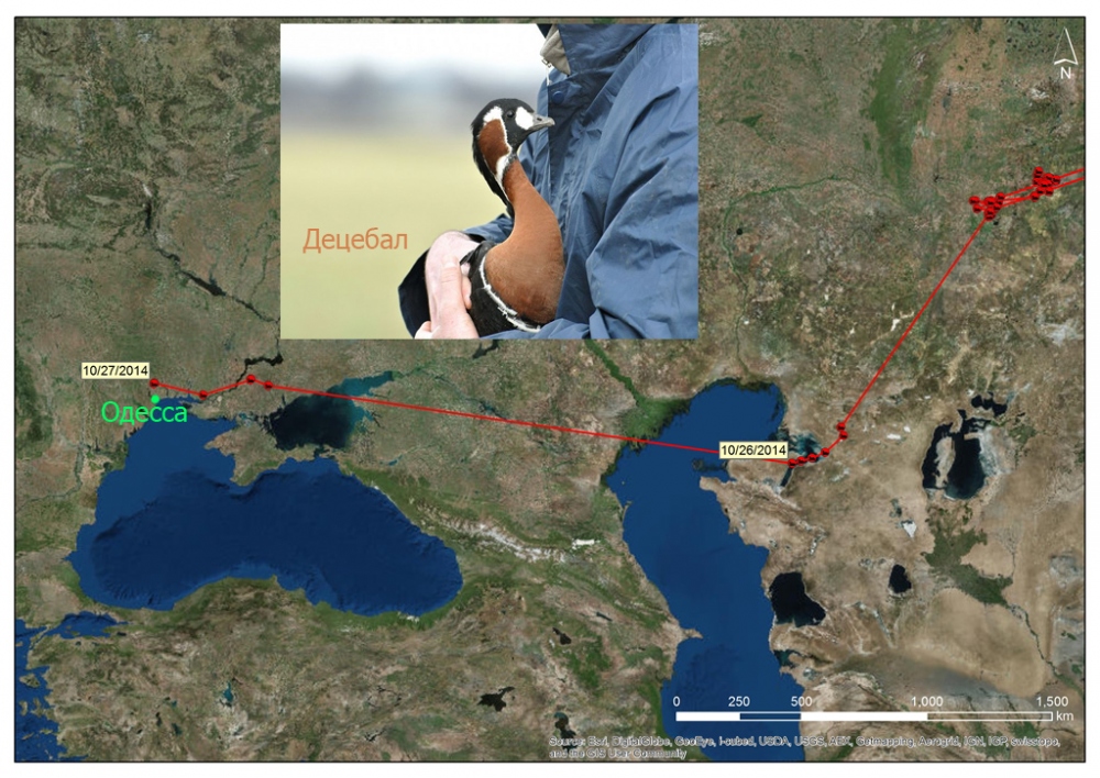 Всего за одни сутки, вчера краснозобая казарка – вид редчайших гусей, занесенный в Красную книгу Международного Союза Охраны Природы, пролетела из России в Украину. Помеченная 12 февраля 2014 г. в Болгарии спутниковым датчиком казарка по кличке Децебал (в честь царя даков, объединивший придунайские племена в начале 1 тысячелетия) показала уникальный рекорд – 1800 км за одни сутки! Она уже больше месяца летит из российской Арктики, скитаясь по казахским степям и озерам.