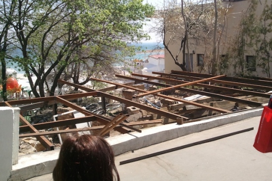 Портофино успешно заканчивает остекление трехэтажной бетонной будки на пляже.