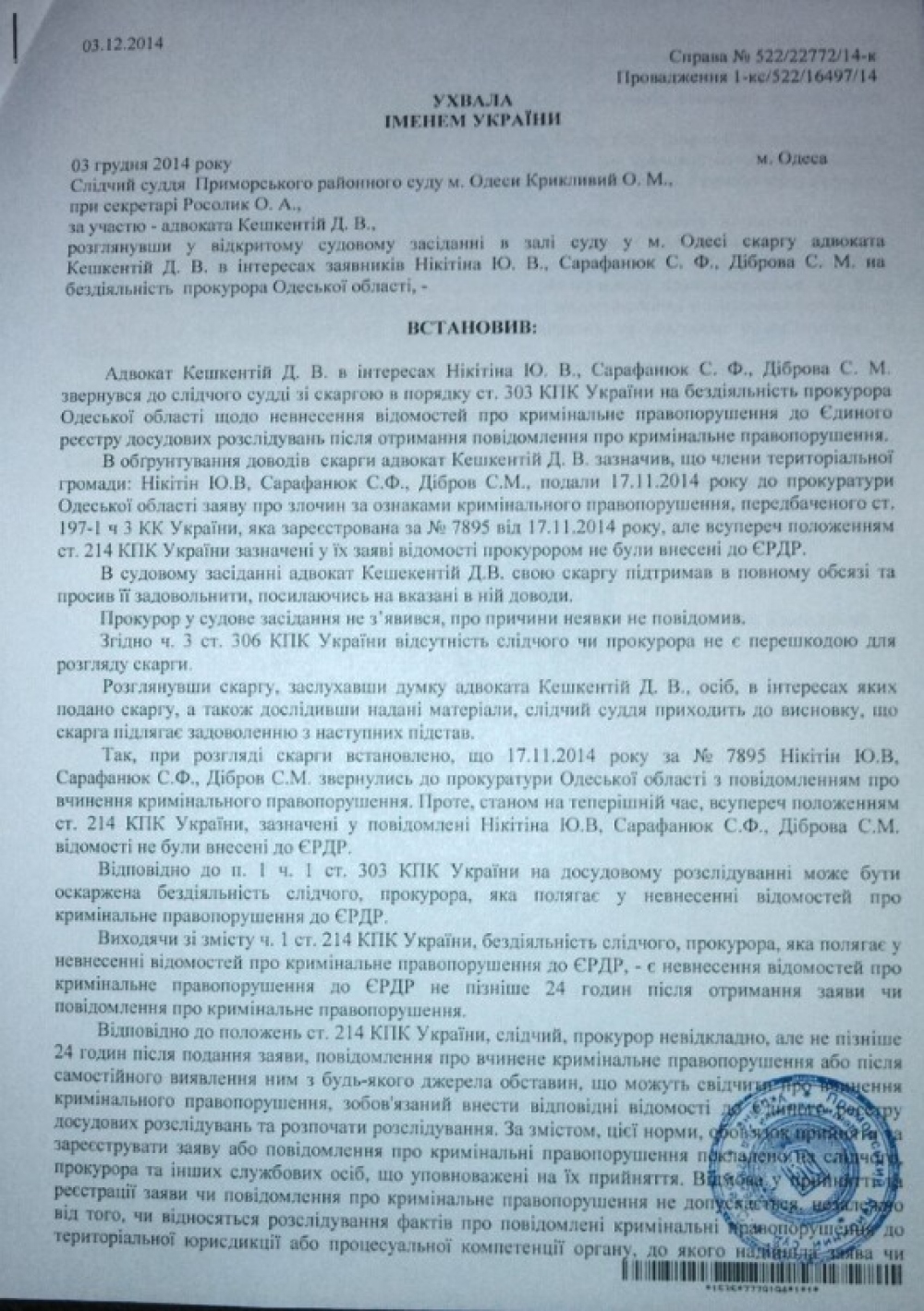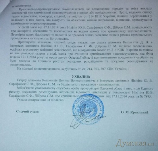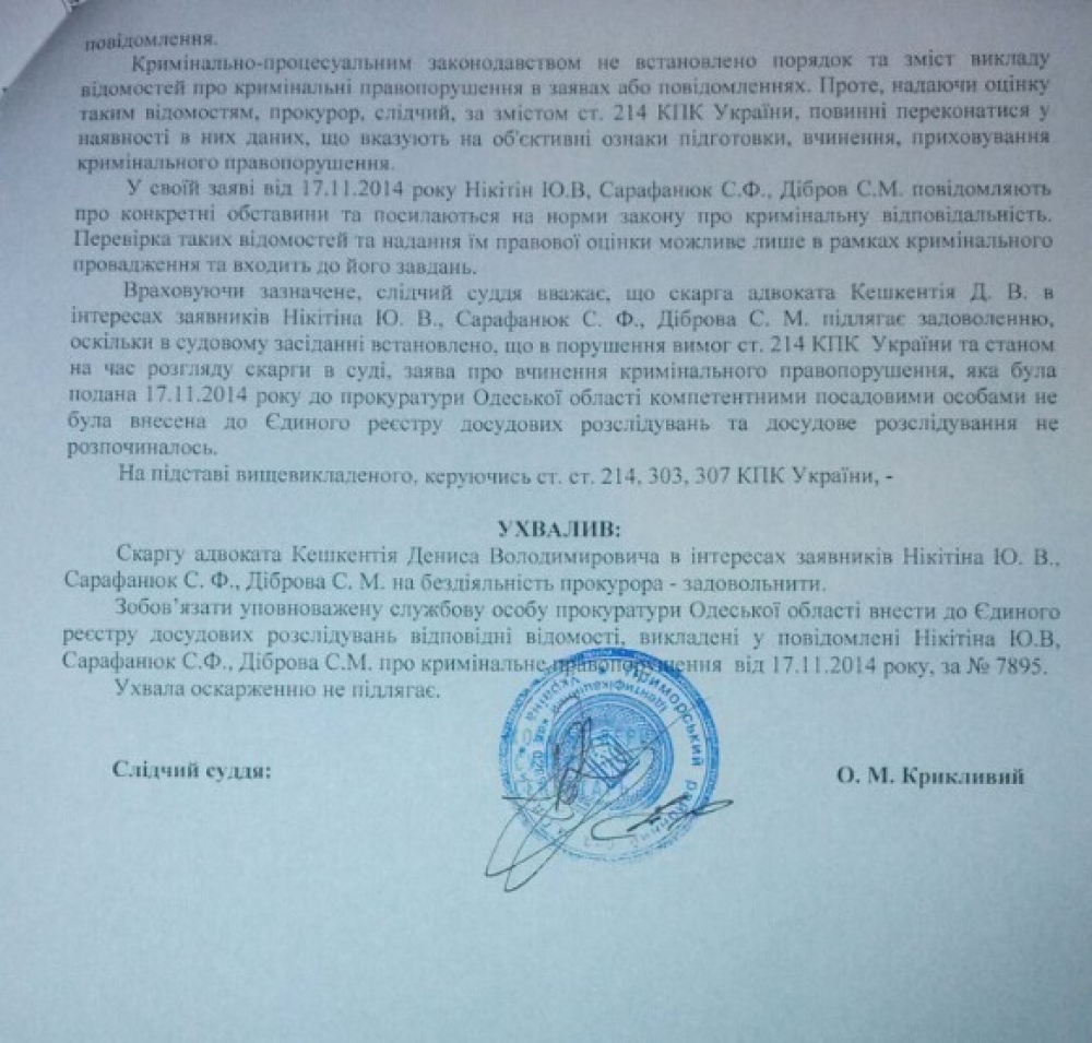 Сегодня Приморский районный суд Одессы удовлетворил жалобу адвоката Кешкентия в интересах одесситов, которые подали на имя прокурора области уведомление о преступлении — захвате земли и самовольном строительстве на Ланжероне. Суд признал, что прокурор области, получив уведомление был обязан незамедлительно, в течение 24 часов, внести данные в Единый реестр досудебных расследований и начать расследование обстоятельств дела. Установлено, что вопреки требованиям Уголовно-процессуального кодекса, это не было сделано. Своим постановлением судья Крикливый обязал прокурора области внести информацию в реестр и начать досудебное расследование. Ранее прокуратура сообщала, что досудебное расследование было начато 27 ноября, то есть через десять дней после подачи заявления. Напомню, что заявление было подано 17 ноября — после митинга, который проходил в районе стройплощадки. На тот момент была проведена вырубка деревьев и вывезен плодородный слой грунта. В заявлении мы просили принять меры по прекращению работ и установлению виновных. За время бездействия прокуратуры на берегу появилась не предусмотренная документацией двухметровая подпорная стенка, а часть искусственно уположенного склона выровнена и заасфальтирована. Вполне вероятно, что это и было целью волокиты — дать возможность людям, совершившим самозахват, построить объект и поставить жителей города перед фактом. |