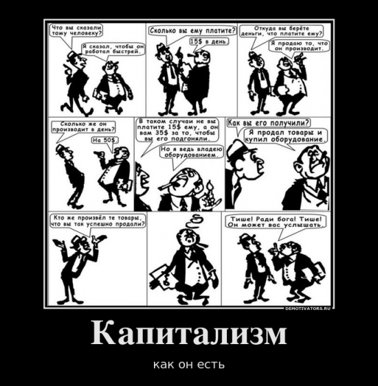 Во времена подъема капитализма начала 2000-х все буквально нарадоваться не могли после ямы 90-х, что вот оно благоденствие, вот он рай капиталистический, кредиты валялись под ногами дешевые, живи — не хочу… И, конечно, незачем было бороться с капитализмом. Во времена начала мирового экономического кризиса в 2007 году все подумали, что это шутка такая, ничего такого, где-то там лопнуло пару ипотечных кредитов далеко в США, кризис не чувствуется особо, капитализм — это прекрасно… Зачем с ним бороться? «Кризис у вас в головах» — вот недалекое мнение обывателя тех времен. Когда кризисный капитализм медленно и уверенно набирал обороты, переходил с отрасли на отрасль, перескакивал со страны на страну, когда начал подтачивать благоденствие самих почитателей капитализма году этак в 2012-м, то все подумали, что кризис здесь ни при чем, а виноват Янукович, Пшонка, Азаров, еще кто… Какая разница кто? «Главное, что рыночная экономика и капитализм – здесь ни при чем! » — размышляло мещанское сознание. И тогда началась борьба.В 2014 году свергли ненавистных тиранов, мешавших «правильному» капитализму и пошли в Европу. Там же счастье и благоденствие. И правильный счастливый капитализм. Зачем с ним бороться? Капитализм – это прекрасно! А «правильный» капитализм не дремал, он развивался, реагировал и отвечал. Развязал войну бессмысленную и братоубийственную, люди обнищали донельзя, предприятия стали, горячую воду и отопление отключили, продукты питания и лекарства вздорожали… «Правильный» капитализм стал целенаправленно точечными ударами разрушать жизни своих приверженцев и фанатов. Но война ведь где-то там и капитализм здесь ни при чем. Это все Путин, Порошенко, хунта одна или вторая… И боролись они с ними, а не с капитализмом… И думали каждый о своих спасителях: Европе, России, Америке… И умирали пачками просто… Но думали, что капитализм — это все равно прекрасно… Что будет и на нашей улице еще праздник! Они ведь не читали работу одного из классиков анализа капиталистической системы, думали что капитализм это вери гуд и с ним не надо бороться. В 30-х годах этот классик, подвергшийся сталинским репрессиям и убитый впоследствии агентом советских органов госбезопасности писал: «Нынешний режим, переходный от капитализма к социализму мог бы в указанном выше случае уступить своё место только капитализму. Это был бы капитализм особого типа: по существу колониальный, с компрадорской буржуазией, капитализм, насыщенный противоречиями, исключающими возможность его прогрессивного развития. Ибо все те противоречия, которые согласно нашей гипотезе, могли бы привести ко взрыву советского режима, немедленно перевоплотились бы во внутренние противоречия капиталистического режима и приобрели бы вскоре ещё большую остроту. Это значит, что в капиталистической контрреволюции была бы заложена новая Октябрьская революция». И здесь пришла последняя волна развития кризисного капитализма — империалистическая, и накрыла всех с головой. Они сами, их родители и дети, все они погибли потому, что не боролись с капитализмом и думали, что он ни в чем не виноват. Если ты не борешься с капитализмом сейчас, то завтра он поборется с тобой. Доведет до нищеты и бесправия, обанкротит и обесчеловечит, а затем убьет тебя, твоих близких, знакомых и друзей! Вставай и борись! Пока не 