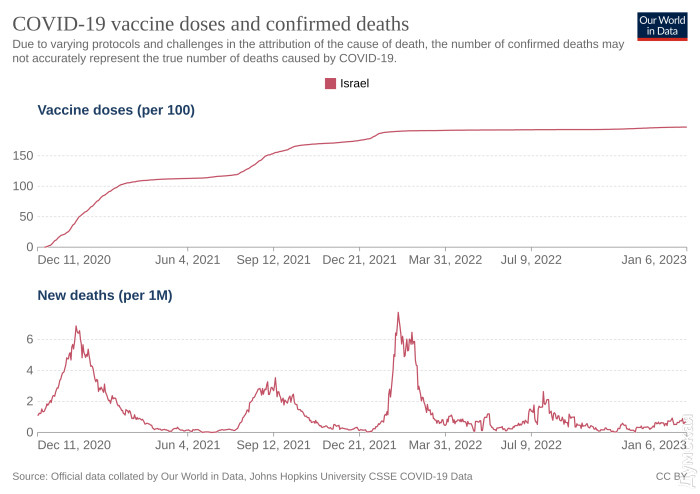 Цікаві події відбуваються в Ізраїлі. Там шукають контракти, на підставі яких фірма Pfizer постачала вакцини проти COVID-19. Ці контракти цікаві в першу чергу тому, що їх, схоже, нікому ніколи не показували. Там ціни, обсяги, умови поставок та, кажуть інші вимоги — наприклад, про нерозголошення даних про ускладнення та побічні реакції. Зараз їх дуже хоче побачити ізраїльський суд, але марно — їх не можуть знайти. Мовляв, «все обшукали, ніде немає, і навіть невідомо, чи були вони взагалі. В Україні поки складається схожа ситуація. Договори, за якими витратили купу бюджетних грошей, на вимогу постачальника (! ) визнали «конфіденційною інформацією», хоча це прямо заборонено законом. Я намагаюсь отримати їх через суд, і мене в цій вимозі підтримують сотні людей, яки зібрали кошти на компенсацію судових витрат. Перша інстанція мені відмовила. Засіданні по апеляції буде у цю середу, 11 січня, о 10:00. Схоже, нам треба поспішати, щоб потім не було так, як зараз в Ізраїлі. І якщо комусь цікаво — трішки статистики. Масова вакцинація проти ковіду в Ізраїлі фактично припинилася рік тому. За перший рік там зробили 190 щеплень на 100 людей. Протягом останнього року — лише 7 на 100. Тобто про якісь постійні поголовні ревакцинації раз на три місяці, на які так сподівалися виробники вакцин, мова не йде, а Ізраїль вже давно не є світовим лідером з охоплення щепленнями. (на верхньому графіку — кількість використаних доз на 100 людей, на нижньому — кількість смертей на мільйон) |