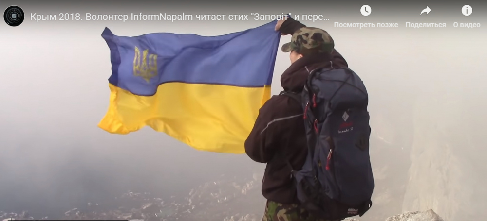 «Волонтери InformNapalm біля Храму Сонця, в Криму, розгорнули прапор України і прочитали вірш із закликом:» Атакуйте соколи, слава Україні! ". І залишили відбиток на пам'ять», — йдеться в коментарі до відео.