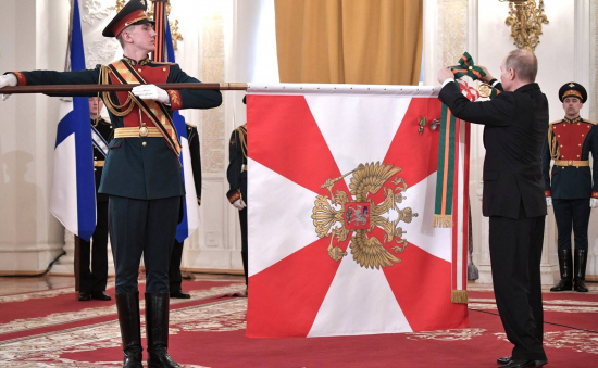 В Путін закріплює орден Суворова на прапорі Червонопрапорного південного військового округу, 2018 рік