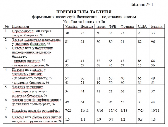 Порівнюючи загальні параметри бюджетно-податкових систем України та деяких країн Європи (Таблиця № 1) можна зауважити, що наша система майже не відрізняється від європейських, принаймні за формальними показниками. Попри це, аналіз матеріалу вказує на певні резерви можливостей якісного реформування бюджетної системи нашої держави.