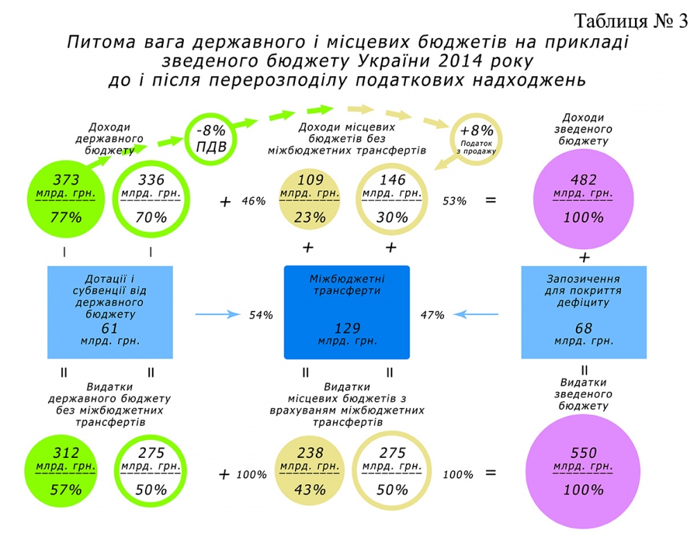 На даний момент у зведеному бюджеті 2014 року (Таблиця № 3) видатки державного бюджету складають 57%, а видатки місцевих бюджетів 43%. Якщо центр передасть на місця 7 % (37 млрд. грн.), то ми отримаємо пропорцію 50% на 50%. Очевидно, що це має відбуватись не через дотації і субвенції, а через закріплення відповідного джерела за місцевими бюджетами. Це відповідатиме духові часу і соціально-політичним очікуванням суспільства. Можна запропонувати звичайний поділ, наприклад надходжень від податку на прибуток підприємств, що становить 43 млрд. грн., в пропорції -15 % (6 млрд. грн.) до державного, а 85% (37 млрд. грн.) до місцевих бюджетів. Такий шлях також приведе до бюджетного паритету, але нам потрібні рішення, які  мали б наслідком активізацію місцевого самоврядування в безперервному пошуку додаткових надходжень до своїх бюджетів.