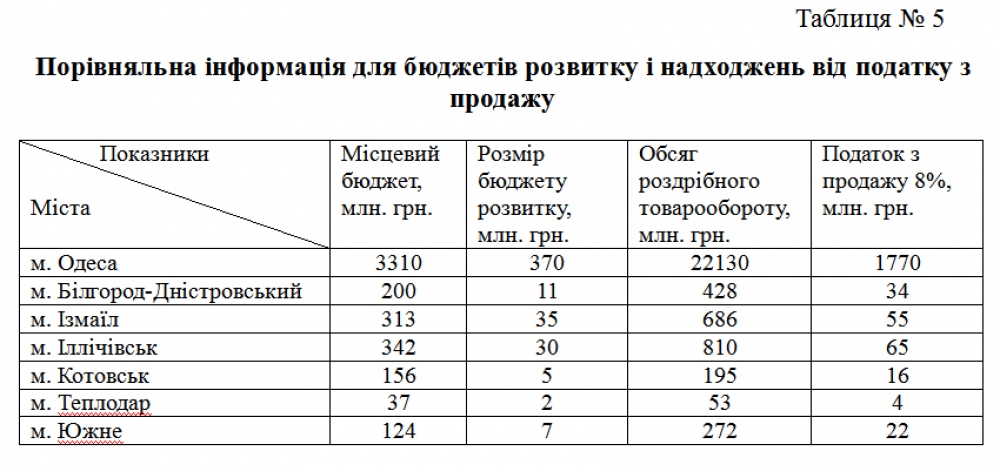 Наведені прогнози (Таблиця № 5) можливих надходжень від податку з продажу для міст обласного значення Одещини демонструють значний потенціал запропонованих змін для збільшення капітальних вкладень в територіальну інфраструктуру.