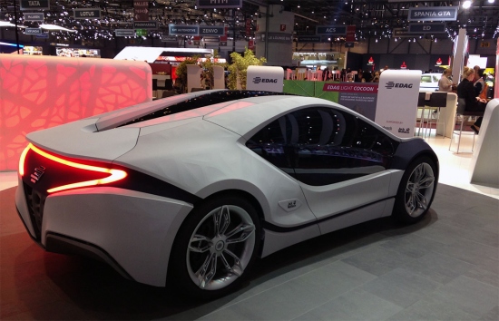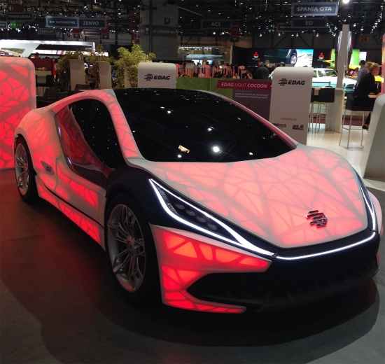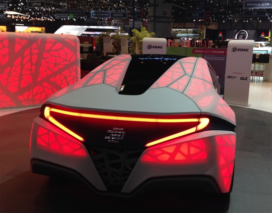 В очередной раз свое видение будущего на основе бионических технологий представила немецкая компания EDAG. На этот раз, вдохновившись строением листа, специалисты EDAG презентовали сверхлегкий концепт компактного спотркара Light Cocoon. Все основные структурные элементы кузова машины распечатаны на 3D-принтере. Экспериментальный автомобиль имеет скелетообразную архитектуру и, как утверждают в компании, содержит только самые необходимые с точки зрения функциональности компоненты. При этом кузов имеет достаточную прочность и абсолютно не требует никаких дополнительных металических элементов или соединений. С помощью внутренней подсветки на светодиодах можно легко разглядеть внутреннюю конструкцию Light Cocoon. C внешней же стороны концепт обшит сверхлегкой водонепроницаемой тканью Texapore Softshell 02+. Эта ткань трехслойная синтетическая ткань, которая при этом в четыре раза легче печатной бумаги.