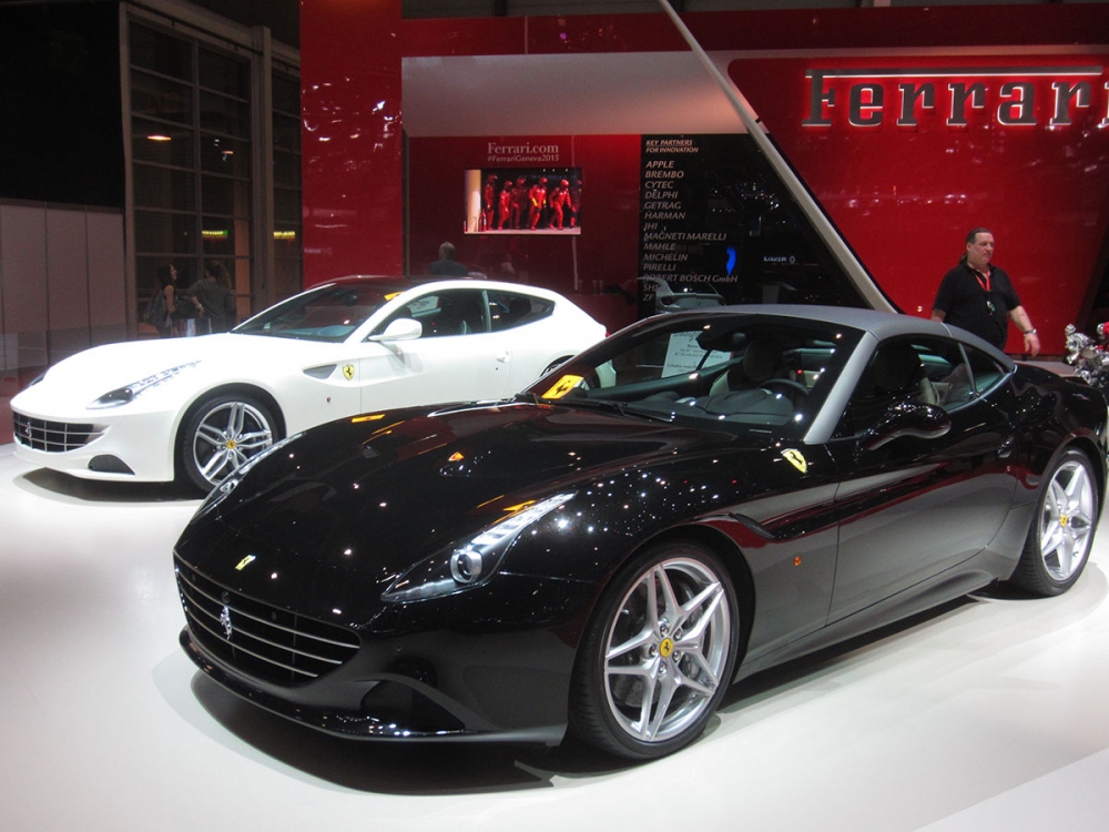 На стенде Ferrari также можно было заметить модели FF и California T. Выполненная в белом цвете Ferrari FF считается самым быстрым в мире четырех-местным спорткаром. FF обладает 6.3-литровым двигателем V12 и развивает мощность в 650 л.с., набирая при этом скорость 100 км/ч за 3.7 секунды. Максимальная скорость Ferrari FF — 335 км/ч. На ее фоне черная California T выглядит немного скромнее: 3.9-литровый двигатель V8 с мощностью 550 л.с. Тем не менее California T довольно шустрая модель и совершает разгон до 100 км/ч всего за 3.6 секунды. Ее максимальная скорость же составляет 315 км/ч. Ferrari FF и California T предлагаются по цене в $300, 000 и $200, 000 соответсвенно.