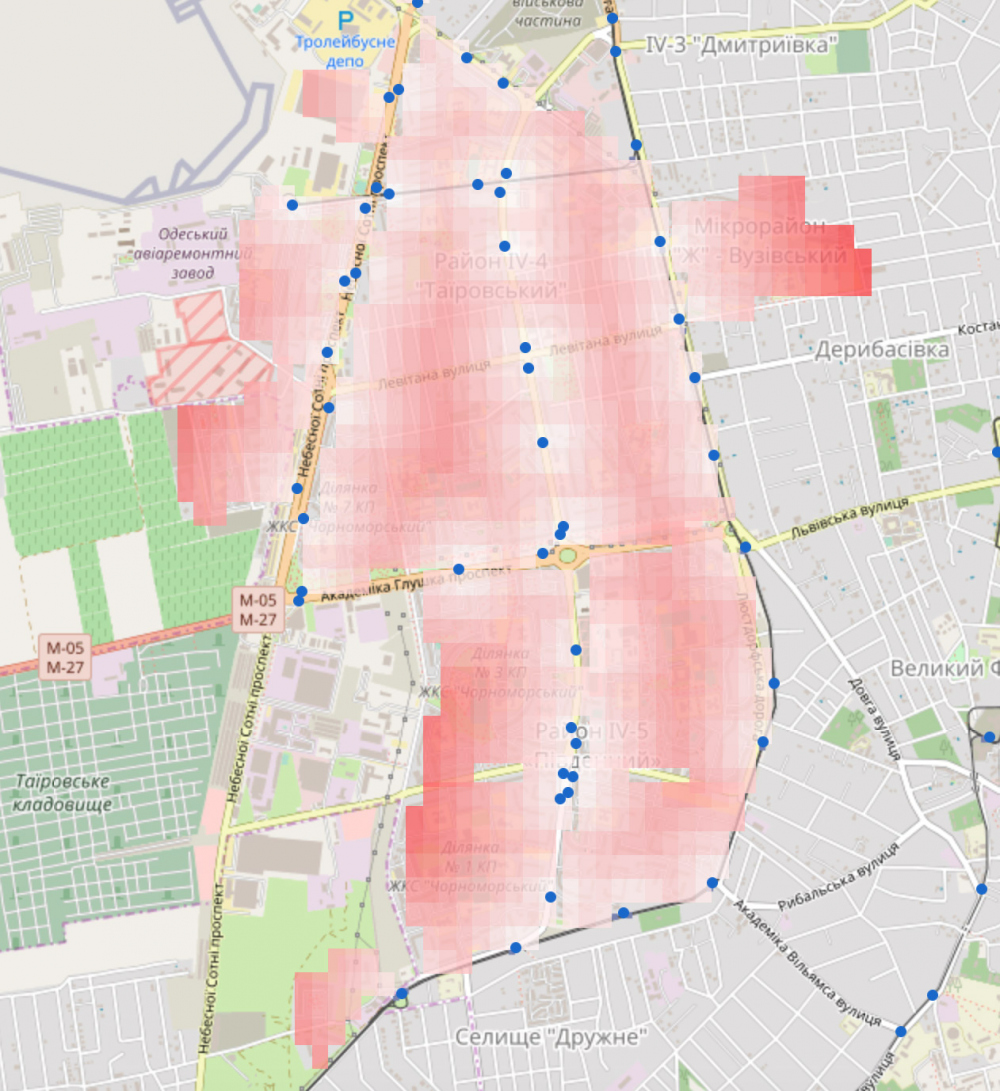 После предыдущего поста про маршрутки я задумался о том, как избавить от них город. Одна из проблем в том, что для многих людей маршрутка — единственный доступный вид транспорта возле их дома или работы. Очевидно, что нужно создавать новые маршруты трамваев и троллейбусов в городе. Сейчас в город едут 46 новых троллейбусов и возможно пришло время создавать новые маршруты. Поэтому я составил карту, на которой отметил все районы с многоэтажной застройкой или важными для одесситов объектами — аэропорт, пляжи, ТРЦ. Синие точки — это существующие остановки трамваев и троллейбусов. Чем краснее квадрат — тем дольше человеку пешком добираться до такой остановки. В идеале для любой из этих зон остановки должны быть в пешеходной доступности — то есть до 300-400 метров. Рассмотреть подробнее можно здесь: http://bond.od.ua/trollmap/ Я пока не дошел до рисования новых маршрутов. Поэтому первые поверхностные выводы: 1. Троллейбус №14 (идет в аэропорт) нужно пустить не по Овидиопольской дороге, а по улице Центральный аэропорт — там есть многоэтажки, которые станут покрыты электротранспортом. А общая длина маршрута не изменится. 2. Нужен маршрут, который бы улучшил покрытие Черемушек. С Ицхака Рабина/Инглези по Инглези до Ивана и Юрия Лип и оттуда на Малиновского и дальше в центр по Краснова/Среднефонтанской, например. 3. На Таирова с покрытием тоже не очень — улица Ильфа и Петрова, Жемчужины, микрорайоны Невского/Шишкина, Школьный и Радужный — всё это не покрыто электротранспортом. 4. Не хватает обещанного еще при Гурвице троллейбуса на Балковской. А еще лучше вернуть туда трамвай на выделенной полосе. 5. Не понятно нужны ли кому-то троллейбусы 8, 12, которые едут в промышленные районы. Возможно проще доставлять немногочисленных рабочих в эти районы на автобусах предприятий, а не гонять туда пустые троллейбусы. 8-ой троллейбус мог бы заканчиваться в районе Испанского переулка, например. Аналогично с трамваями, которые ходят аж на Центролит и в Рыбпорт. Подозреваю, что туда ездят единицы и как раз их то можно пересадить на маршрутки. 6. Самый ужас на посёлке Котовского. Там просится кольцевой маршрут троллейбуса вокруг всего района. Сообщение с центром города оставить трамвайным. Троллейбус только внутри района. Будет время позже — попробую нарисовать новые маршруты. Или если кому-то из вас не лень — можете попробовать )