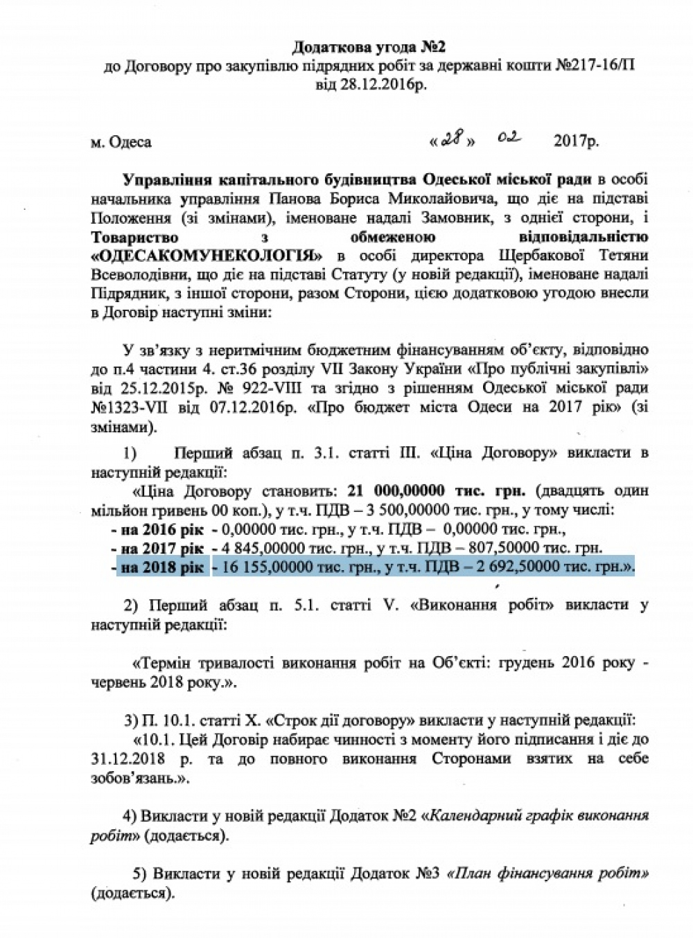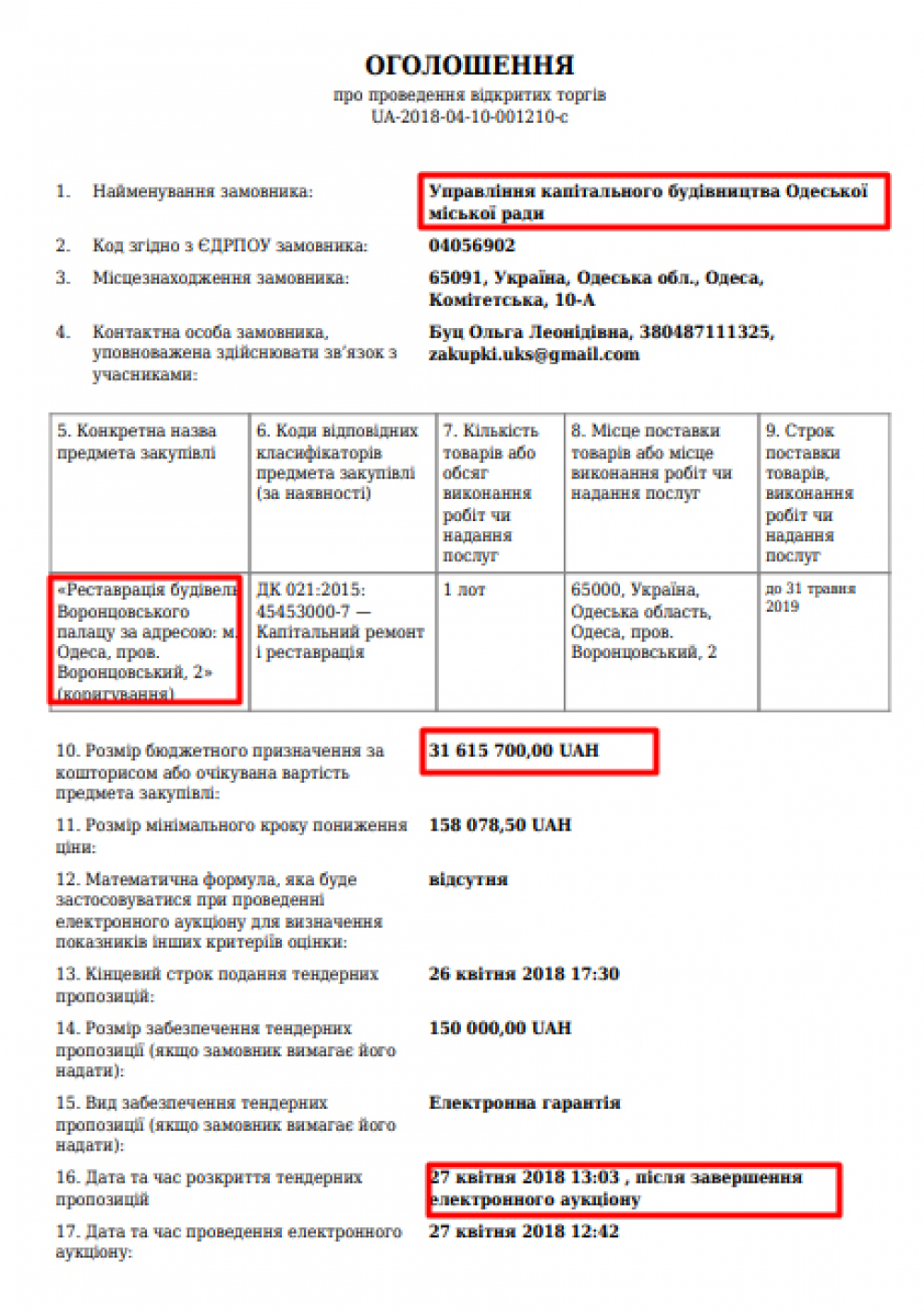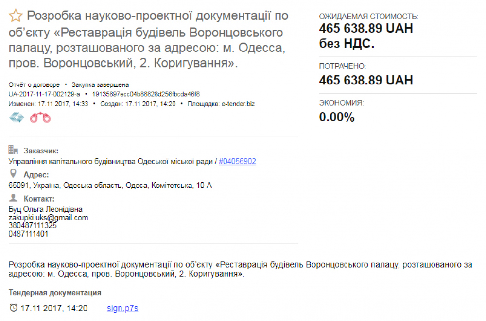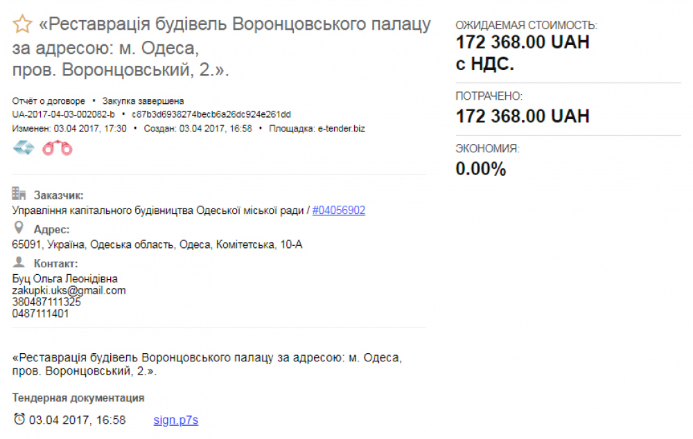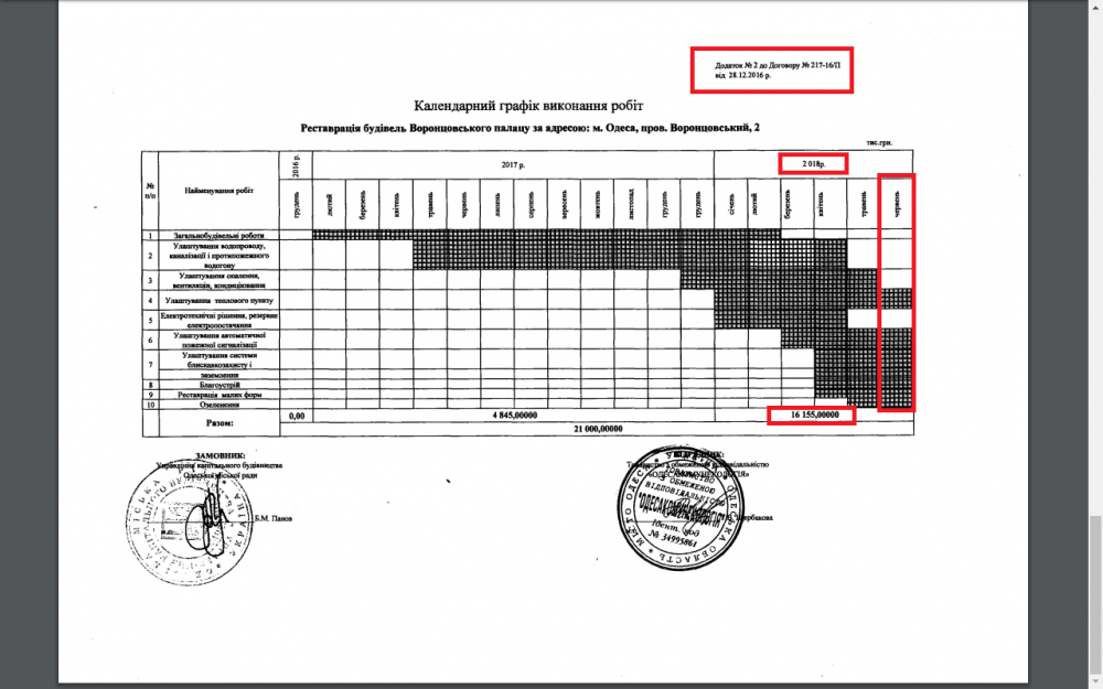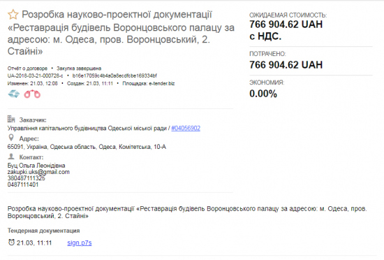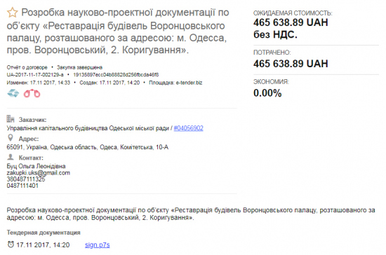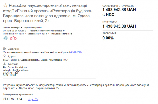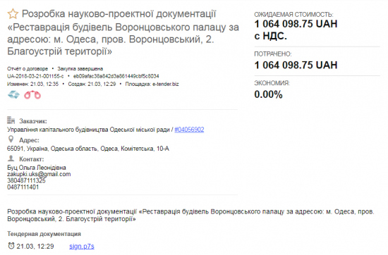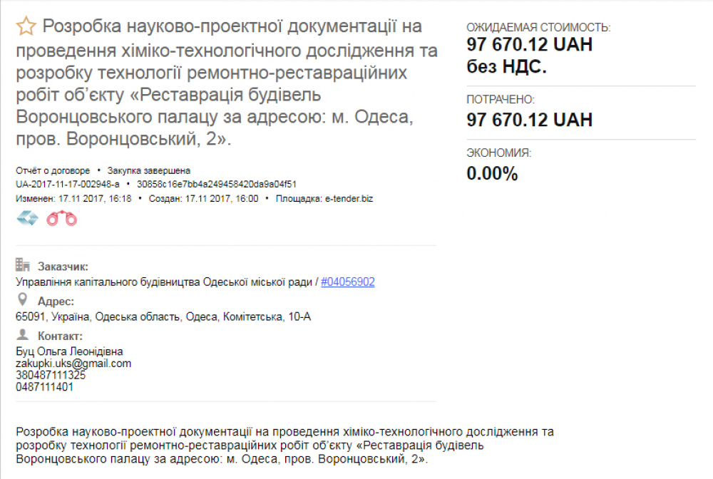 Еще в ноябре 2016 года местные власти огласили тендер на реставрацию Воронцовского дворца. Тогда подряд на выиграла, горячо любимая нашим горсоветом, фирма ООО «Одесскомунэкология». Согласно последним изменениям к договору с подрядчиком, реставрационные работы должны были закончится в июне 2018 года. Но все пошло не по плану и Петр Рябоконь заявил, что рыботы затягиваются, а «основная причина тому — отсутствие каких-либо планов и схем» (с) Рябоконь (27.04.2018 год) «Мы начинаем работать и только тогда узнаем, с чем нам пришлось столкнуться! » — отметил чиновник. Поскольку речь идет о памятнике культуры и архитектуры, то все вопросы реконструкции, вплоть до стройматериалов, согласуются аж на уровне Министерства культуры и на это также требуется время! На самом же деле документация давно уже сделана, просто скорее всего она некачественная. В общей сложности ее делали 6 раз и одесситы заплатили за это более 4 млн. грн. И это только на проектные документы. В разработке поучаствовал даже государственный институт НАН. Неужели такого кол-ва экспертов и средств было мало дабы подготовить корректную документацию для реставрации Воронцовского дворца? «…реконструкционные работы вообще каких-либо конкретных сроков не признают! » — а Управление Капитального Строительства признает сроки финансирования по договору с подрядчиком? Согласно договору с фирмой «Одесскомунэкология» основная сумма финансирования в 16 000 000 грн. должна была состояться в 2018 году. А согласно графика выполнения работ, фирма за эту сумму должна была провести следующие работы: Судя по актам и выплатам, эти работы уже проведенны. Однако в тот момент когда Петр Рябоконь давал интервью о сложностях реставрации Воронцовского дворца, он забыл упомянуть о том, что в этот же момент Управление капитального строительства проводило еще один тендер на эти работы. Неужели он не знал? ;) И как вы думаете кто выиграет данный тендер? ;) Естественно ООО «Одесскомунэкология»!