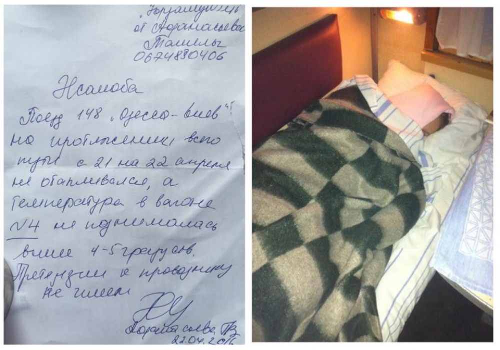 На прошлой неделе, я ехала из Одессы в Киев поездом #148. Когда я вбежала в последнюю секунду в вагон, соседи по купе сказали, что проводник предупредил о том, что ЗАКОНЧИЛСЯ ОТОПИТЕЛЬНЫЙ СЕЗОН В СТРАНЕ И ПОЕЗДА ТОЖЕ ТЕПЕРЬ НЕ ОТАПЛИВАЮТСЯ. За почти 300 грн, которые мы заплатили каждый за билет, нам выдали по тонкому одному одеялу, я спала в пальто, а в вагоне ночью была температура 4-5 градусов. Со мной ехала женщина, у которой утром поднялась от холода температура, в вагоне были дети и пенсионеры, которые также сильно мёрзли, хотя и здоровые взрослые также не должны подвергать организм такому стрессу! Мы все понимаем, что когда в квартире выключают отопление, то есть дополнительные одеяла, свитера, грелки и тд, а когда это происходит в железной коробке, которая мчится навстречу холодному ветру — то холод внутри неимоверный! Мы собрали подписи всем вагоном и написали обращение в УКРЗАЛЫЗНЫЦЮ, но это вряд ли решит вопрос! Факт в том, что поезда переполнены, билеты оплачиваются за наличные и это большие суммы с каждого состава, а люди, мёрзнут как в 1941-45 гг и ДАЖЕ НЕ ПРЕДУПРЕЖДЕНЫ о прекращении отопления! Хочу предупредить каждого путешествующего, чтобы готовился и брал лишний свитер и носки; Чтобы это дошло до Премьер — Министра, Министра Инфраструктуры и начальника УКРЗАЛЫЗНЫЦИ, что нельзя с людьми, как с биомассой ЗА НАШИ ЖЕ ДЕНЬГИ!!!