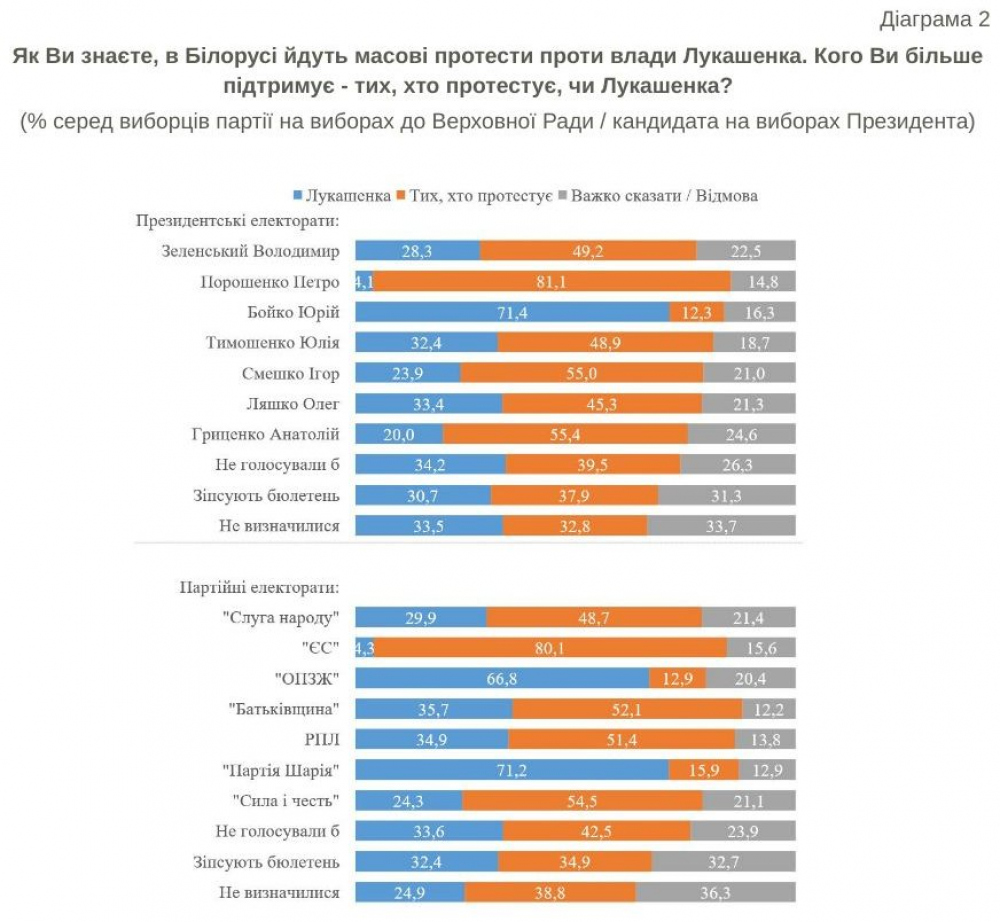 І ось щойно — цікава публікація. Дослідження КМІС: як українці різних політичних поглядів ставляться до подій в Білорусі. Тут дуже чітко можна побачити, до яких ментальніх таборів належать виборці певних політиків та партій. І виборці «Слуг Народу» майже не відрізняються від тих, хто голосував за Тимошенко, Гриценка, Смешка або Ляшка. І це ще раз доволить тезу про їх принаймні латентну проукраїнську позицію.