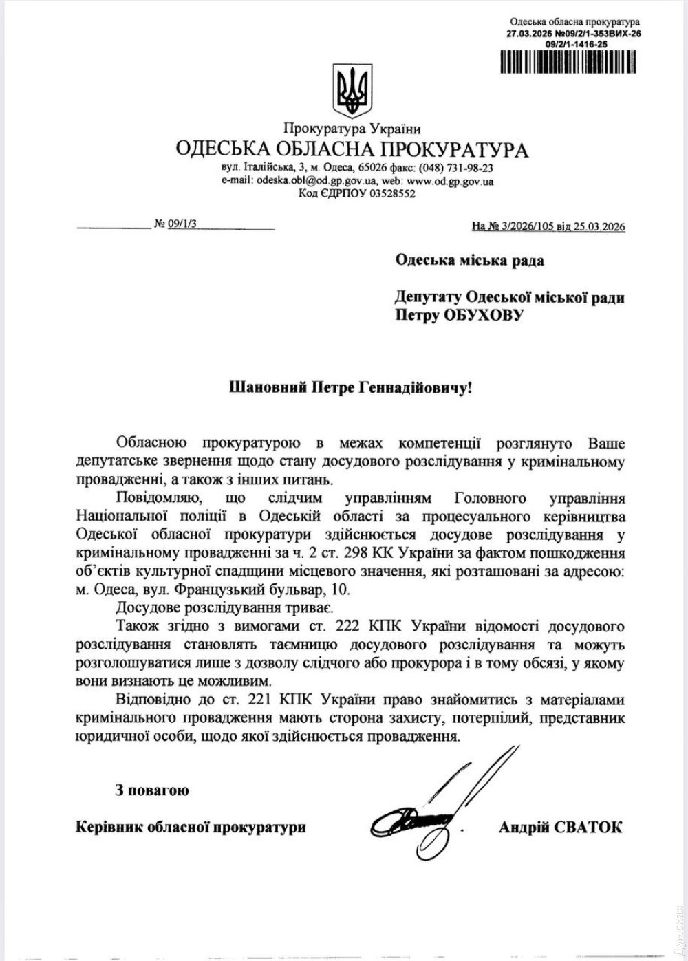 Отримав відповідь від обласної прокуратури на своє звернення щодо пошкодження пам’ятки архітектури на Французькому бульварі.