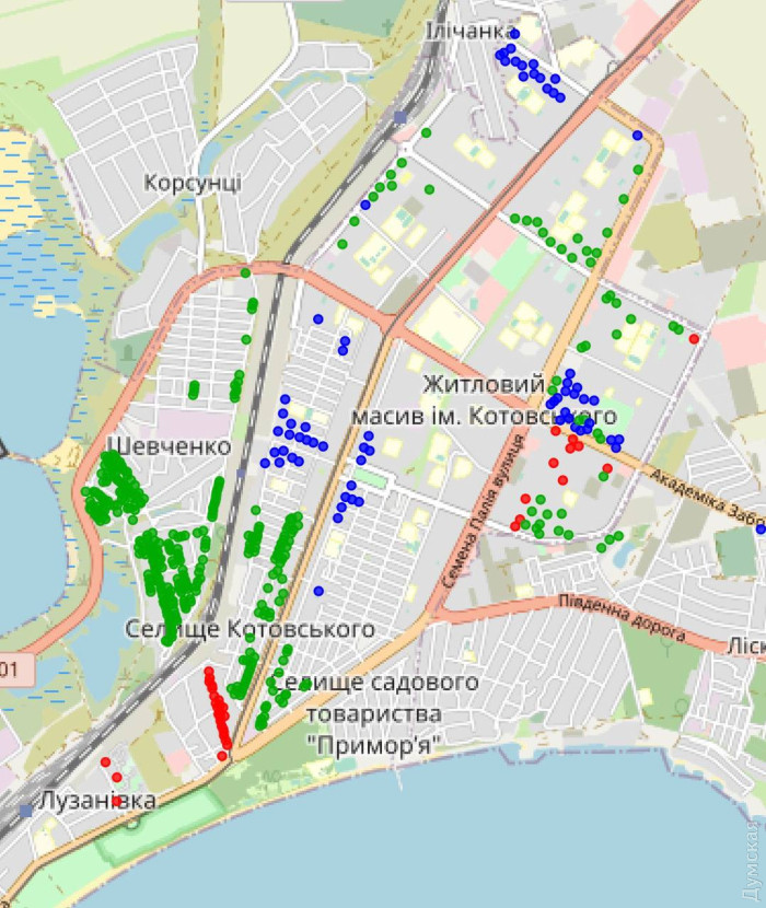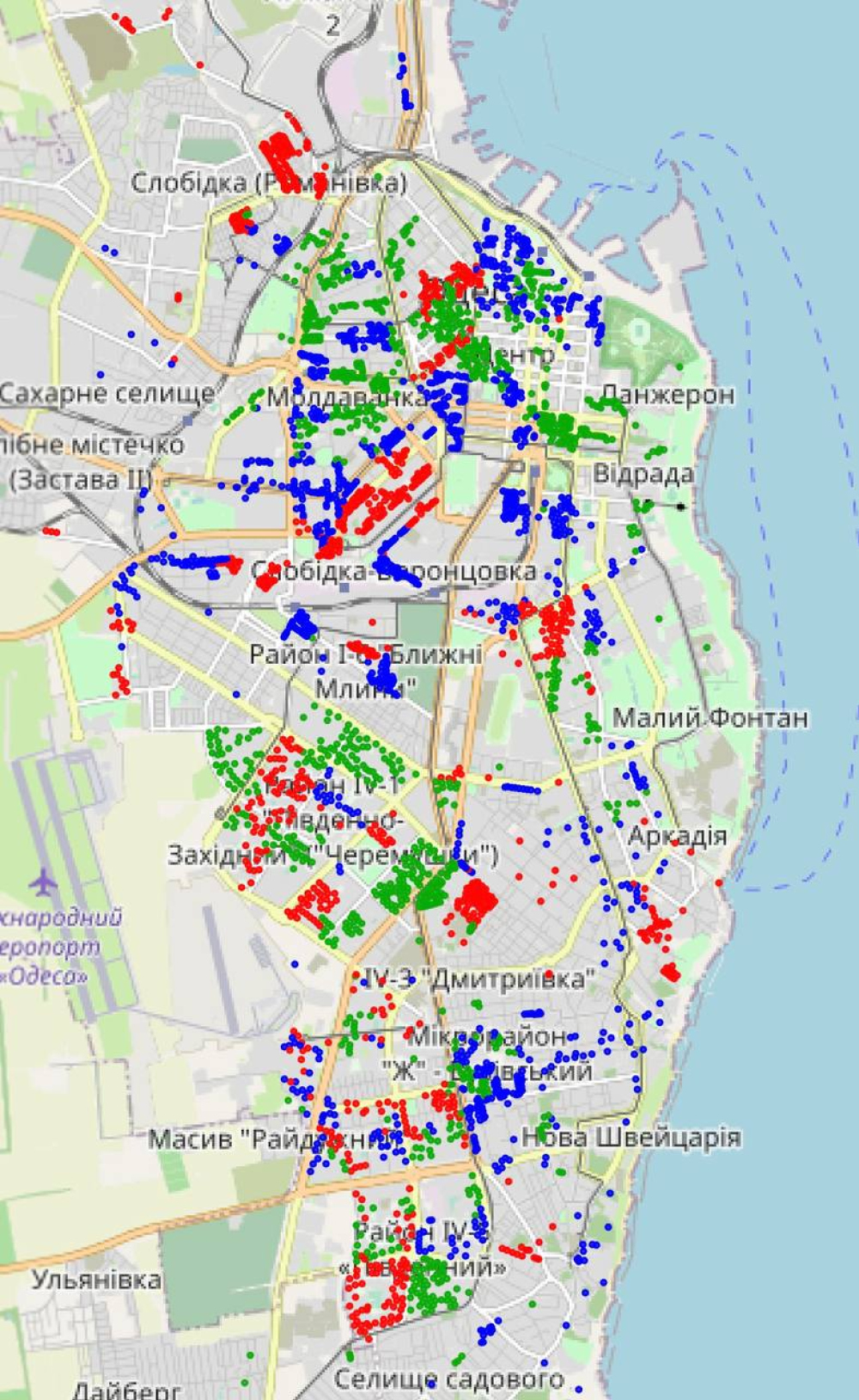 Мені стало цікаво подивитись як це виглядає на мапі міста. Це виявилось не такою легкою задачею. 3 30000 адрес я зміг нанести на карту лише майже 5000. На жаль в базі openstreetmap майже нема адрес приватного сектору, тож вибачайте.