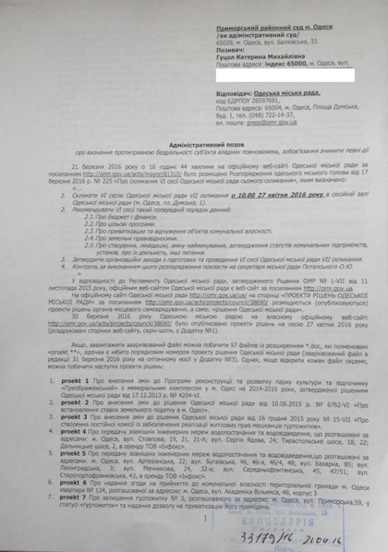 Для того, щоб не допустити чергову махінацію з 39 проектами рішень на майбутній сесії Одеської міськради 27.04.2016 року, представник Громадської організації «Антикорупційний офіс» Катерина Гуцол подала відповідну заяву до Приморського райсуду міста Одеси з проханням захистити права одеситів і нагадати чиновникам міськради, що вони як держслужбовці зобов’язані підкорятися насамперед закону, а не своїм корупційним апетитам.