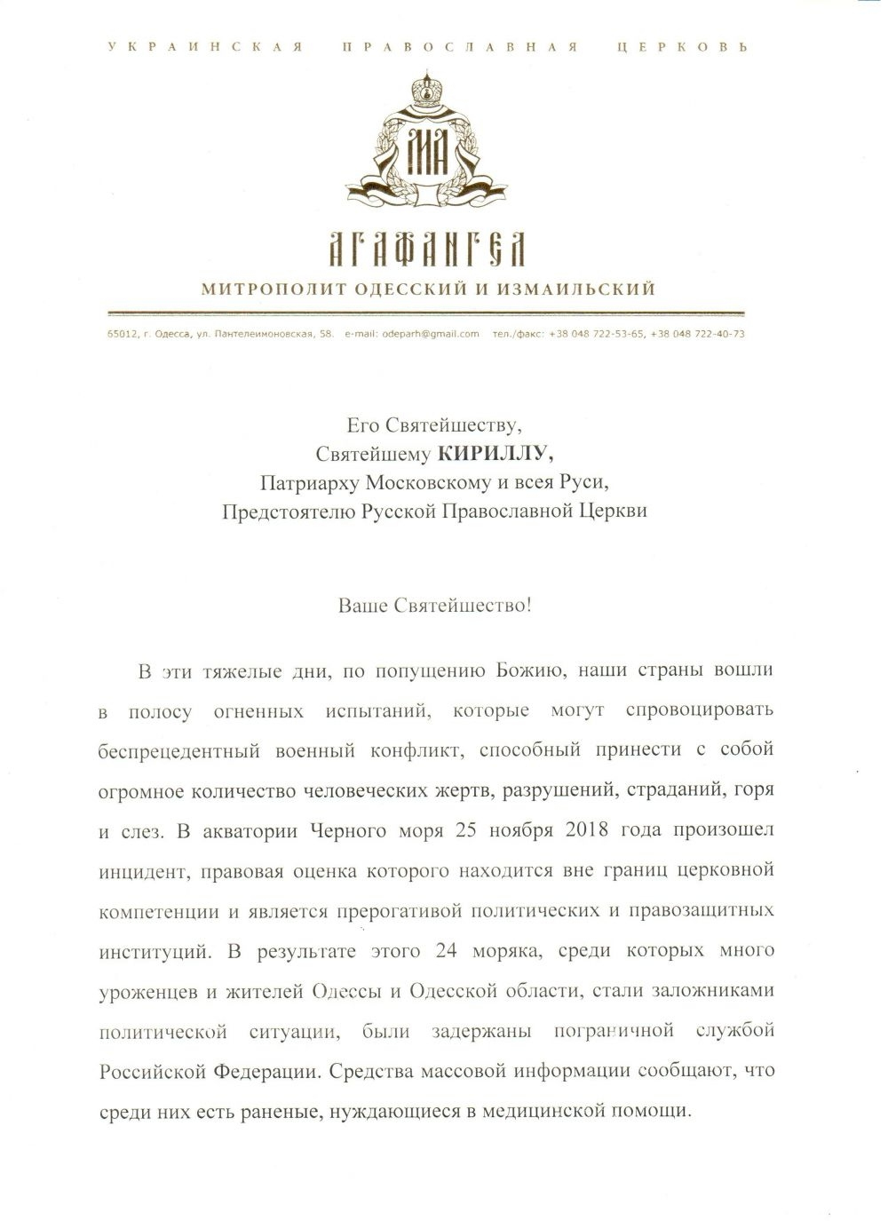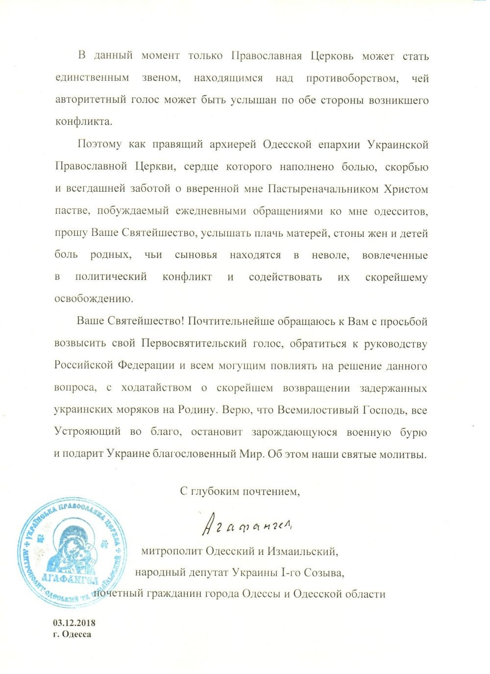 Митрополит Агафангел обратился к Предстоятелю РПЦ с просьбой оказать содействие в освобождении украинских моряков.