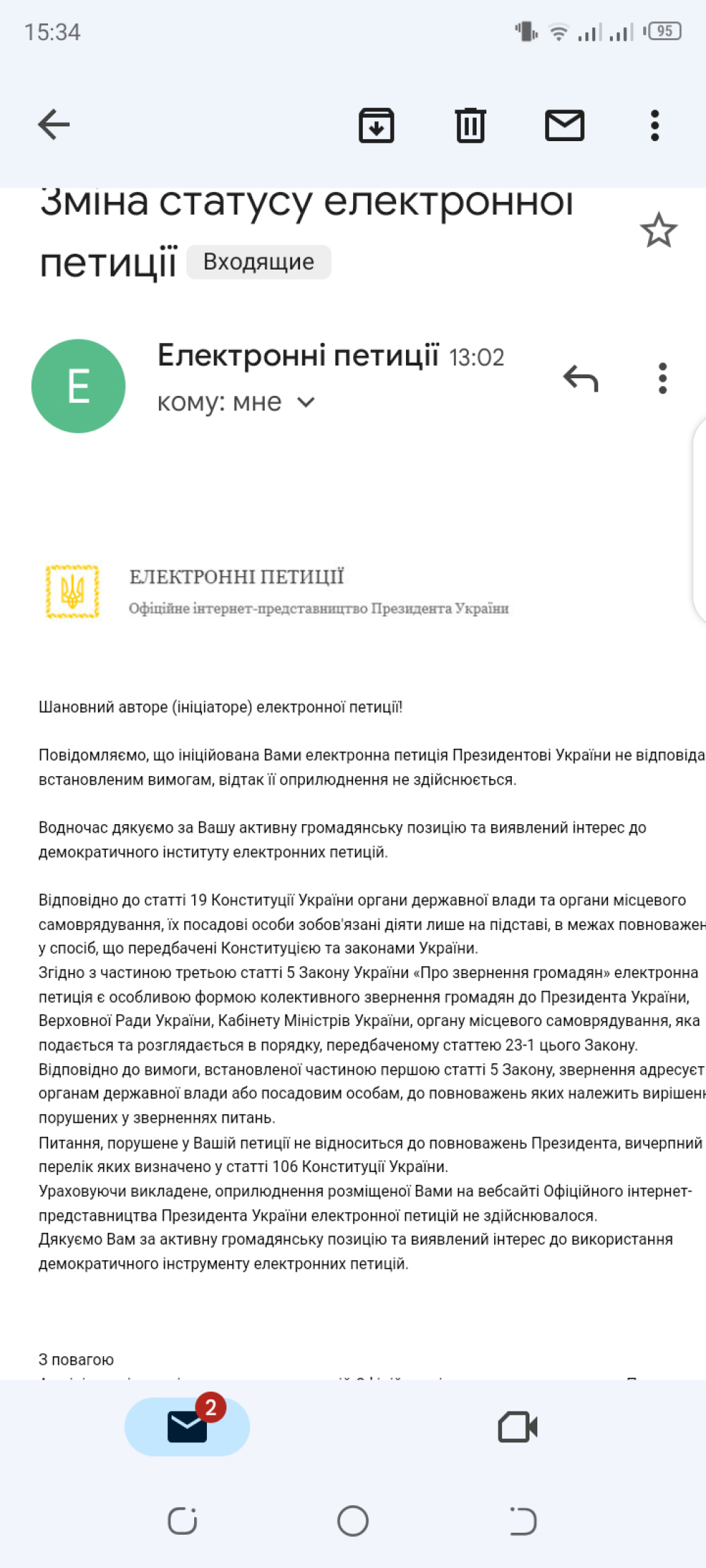 Шановні пані та панове! Прошу увагу та максимальний репост. У зв'язку із призначенням на посаду голови Одеської обласної військової адміністрації скандально відомого Кіпера О.О., мною було складено та 31.05.2023 року подано до Офісу Президента України петицію наступного змісту: «Указом Президента України на посаду голови обласної державної адміністрації Одеської області призначено Кіпера Олега Олександровича. Це призначення є неприпустимим, особливо під час збройної агресії з боку російської федерації, з огляду на моральну та політичну оцінку дій даної особи. Кіпер О.О. в 2010 році, керуючи автомобілем, збив насмерть дитину. Після цього працював в районній прокуратурі в Івано-Франківській області. В період 2010-2014 років різко був підвищений до посади заступника Головного слідчого управління Генеральної прокуратури України. Отже, кар'єрний зріст Кіпера О.О. співпадає з періодом знаходження у влади державного зрадника Януковича В.Ф. та Пшонки В.П., якого оголошено в розшук. Своєю кар'єрою Кіпер О.О. зобов'язаний очільнику Одеської юридичної академії Ківалову С.В. — одіозній людині, яка під час перебування на посаді голові Центрвиборчкому на виборах Президента України у 2004 році сприяла фальсифікації результатів голосування на користь Януковича В.Ф, отримувала винагороди від державного зрадника Януковича В.Ф. та від лідера держави-агресора Путіна В.В., щодо якого Міжнародним кримінальним судом видано ордер на арешт. Кіпер О.О. є фігурантом санкційних списків, накладених РНБО України на осіб, причетних до збройної агресії рі проти України. Фактично, Кіпер О.О. є вихованцем людей, які намагались втілити в Україні ідеологію т.з. «руского миру» — корупція, мафіозна-кланова влада, непрозорість влади, її безкарність. Таким чином, Кіпер О.О. не може обіймати владні посади в Україні, особливо під час збройної агресії. Враховуючи вищевикладене, прошу: 1. Звільнити Кіпера Олега Олександровича з посади голови Одеської обласної військової адміністрації. 2. Унеможливити в подальшому призначення на відповідні посади людей, які працювали під керівництвом злочинців, чия вина доведена в судовому порядку.» Сьогодні мною на електронну пошту отримано лист з відмовою оприлюднення моєї петиції. Нібито питання, про яке йдеться, не належить до компетенції Президента України. Це відверта брехня. Голову обласної військової адміністрації своїм указом призначив на посаду особисто Президент України і саме він і тільки він може її звільнити. Скріншот цієї ганебної, трусливої та незаконної відповіді додаю. Поширюйте! Вони брешуть, отже, бояться. Слава Україні! |