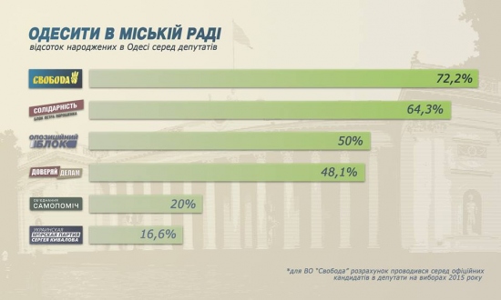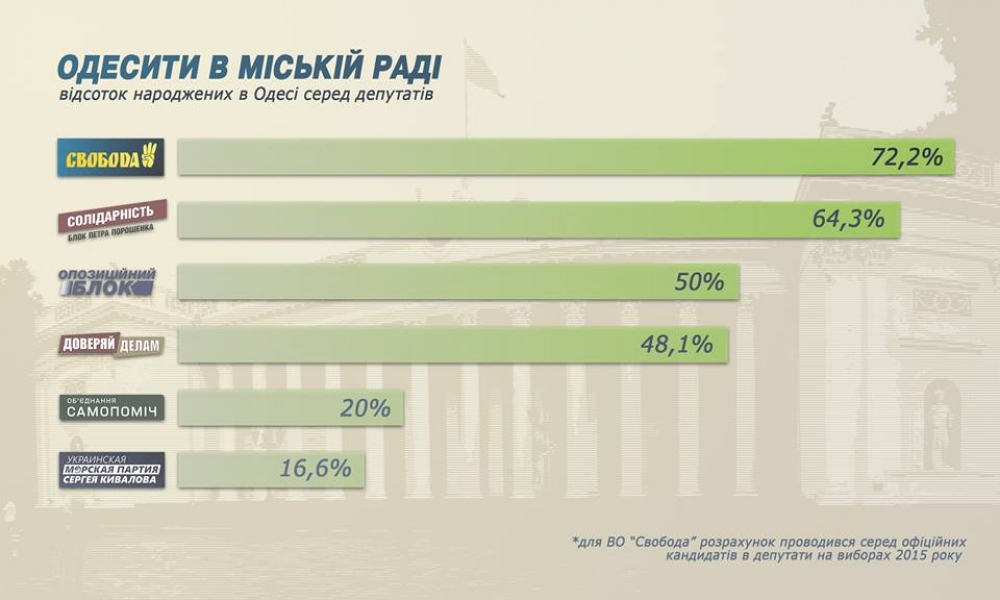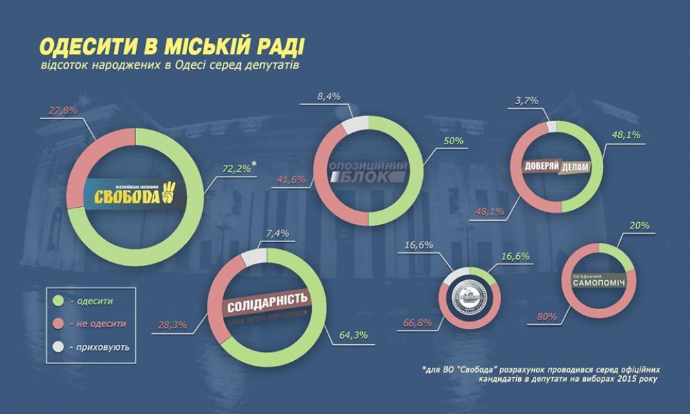 Результати такого дослідження викладені в інфографіці нижче. Інформацію з відкритих джерел і біографій діючих депутатів Одеської міської ради порівняно з даними кандидатів в депутати від ВО «Свобода» на місцевих виборах 2015 року. Роками в регіоні постійно поширювався міф про те, що одесит не може бути українським патріотом і націоналістом. Особливо експлуатують цей стереотип не чисті на руку політики і їхні ЗМІ. Ці хибні тези спочатку дозволяють їм ставати владою, а потім — прикривати свої корупційні оборудки за іміджем «справжнього одесита». Цифри і факти ж не піддаються спекуляціям і однозначно свідчать – серед українських націоналістів і дійсно ідейних людей справжніх одеситів набагато більше, ніж в політичних проектах, що експлуатують фольклорний образ «справжнього одесита». https://www.facebook.com/svoboda.odesa/posts/1669673766397615