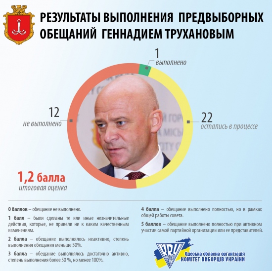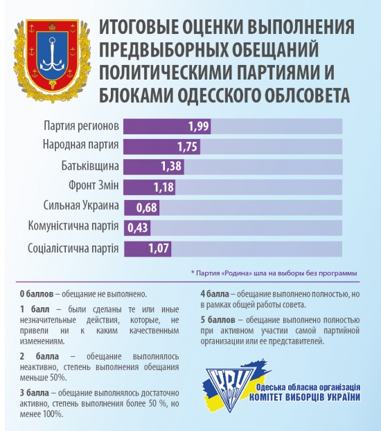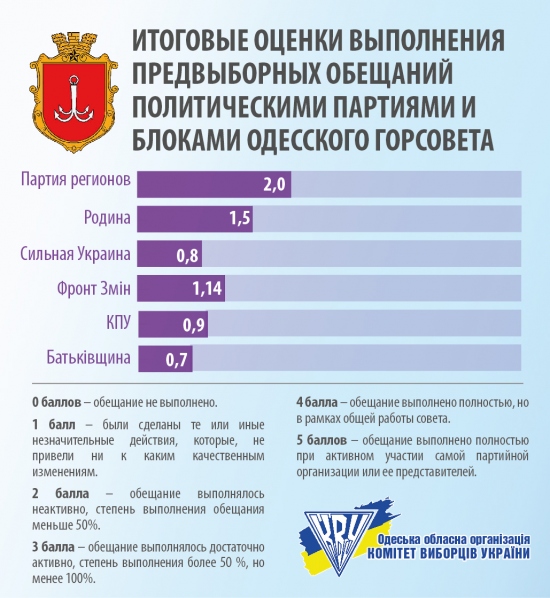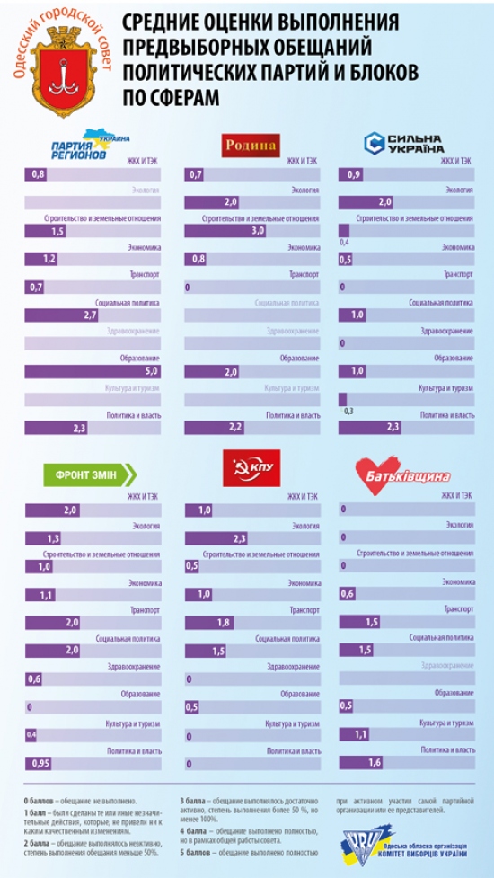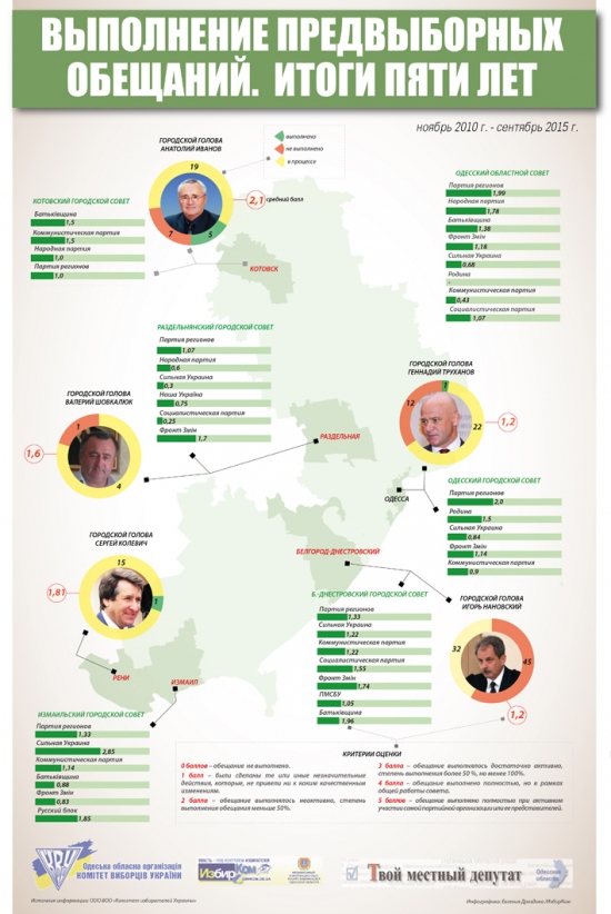 Подвели результаты мониторинга выполнения предвыборных программ одесских политиков. Мониторинг осуществлялся путем сбора информации о деятельности указанных партийных организаций и местных советов, мониторинга публикаций СМИ, анализа документации местных советов (повестки дня, решения), подачи информационных запросов в партийные организации и на основе других открытых источников. Инфоргафика с общими результатами мониторинга: ОСНОВНЫЕ ВЫВОДЫ 1. Предвыборные программы были практически у всех политических сил, как Одесского городского, так и Одесского областного, за исключением партии РОДИНА в областном совете. Наиболее объемными были программы партий Сильная Украина и Фронт Змин. Программа последней была единой и для городского совета, и для областного. При этом программы Фронта Змин и Сильной Украины, как в случае с областным советом, так и городским, содержали наибольшее количество невыполнимых обещаний, что, естественно, не могло не отразится на итоговых оценках выполнения предвыборных обещаний. Наиболее реалистичная предвыборная программа в городском совете была у партии РОДИНА (не содержала ни одного невыполнимого обещания), а в областном — у Партии Регионов (1 невыполнимое обещание). Программа Одесского городского головы, несмотря на то, что, по идее, была рассчитана всего на полтора года, тем не менее, разделена на стратегические и первоочередные цели. Предвыборная программа Геннадия Труханова практически в три раза менее содержательна по сравнению с программой его предшественника: 29% обещаний действующего Одесского городского головы являются заведомо невыполнимыми, в то время как предвыборная программа Алексея Костусева на 12 % была изначально невыполнима. 2. Особенностью работы местных советов подходящего к завершению созыва стало серьезное переформатирование их политических составов с начала 2014 года. Исключением не стал ни Одесский городской, ни Одесский областной советы. Вследствие массовых выходов депутатов из некогда обладавших абсолютным большинством фракций Партии Регионов в городском и областном совете появились новые депутатские группы. Впрочем, в обоих случаях фракции Партии Регионов не прекратили своего существования, поэтому мониторинг выполнения их предвыборных программ продолжался. Кроме того, обладание абсолютным большинством голосов Партией Регионов на протяжении первых трех лет давало этой политической силе карт-бланш на выполнение своей программы. ИНФОГРАФИКА: облКИУ 3. В мае 2014 года на внеочередных выборах был избран новый Одесский городской голова. Соответственно, результаты мониторинга выполнения предвыборной программы Геннадия Труханова охватывают период времени с июня 2014 года по август 2015 года. 4. Тенденцией в работе городского и областного советов стало отсутствие инициатив по реализации своих предвыборных программ. Подавляющее большинство решений инициировалось исполнительными органами и депутатскими комиссиями, крайне редко отдельными депутатами или группами. При этом, даже незначительные успехи в реализации тех или иных предвыборных обещаний на практике не связаны с инициативностью депутатов по выполнению своих программ. Общие итоги выполнения предвыборных программ, как политических партий, так и Одесского городского головы являются крайне низкими. По 